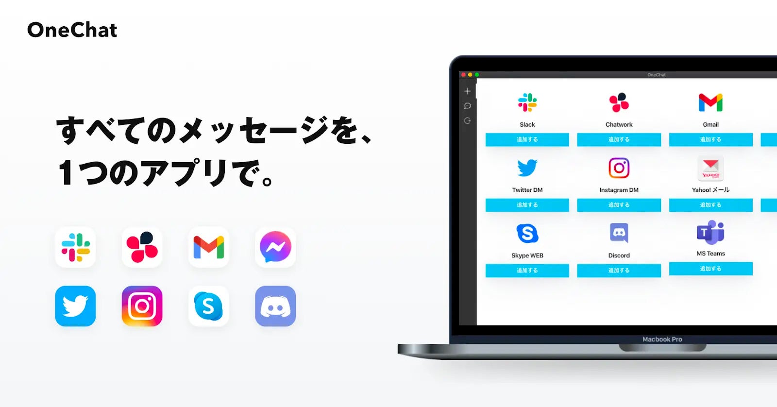 「OneChat」は、1つのアプリであらゆるメッセージツールの確認・返信が可能なチャットアプリの一元管理サービスです。
