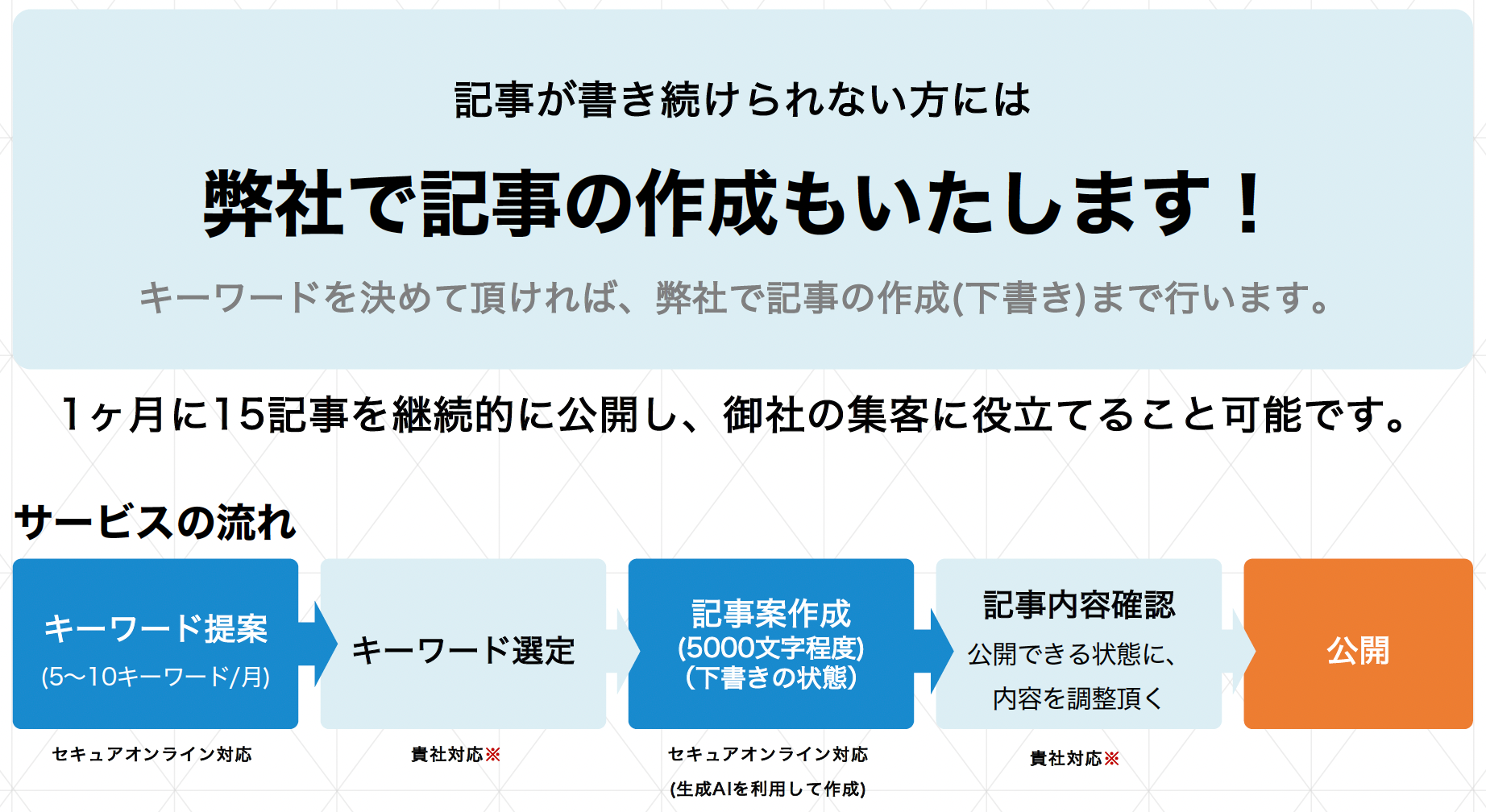 「どのように記事を書けばいいか分からない」という方には、セキュアオンラインが記事の下書きを作成します!魅力を最大限に引き出し、ターゲット層に訴求する内容をお届けしますので、コスト以外にも労力もかけずに専門メディアを持っていただけます。