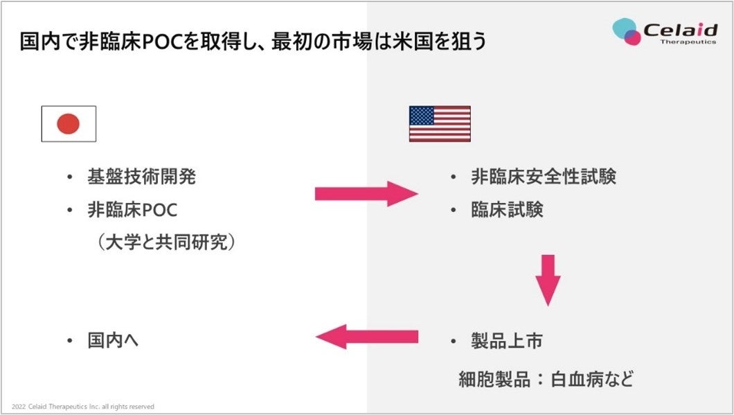 この度調達した資金を活用して、国内で免疫不全マウスを使用した大規模実験を実施し、非臨床POCの取得に向けた活動を進めていきます。POC取得後は米国での非臨床安全性試験、臨床試験を経て、当社として最初の細胞治療製品を米国市場から展開していくことを計画しており、すでに米国での製造等サプライチェーンの構築を目的とした各種企業との具体的な交渉や、薬事・規制(FDA)対応を進めています。