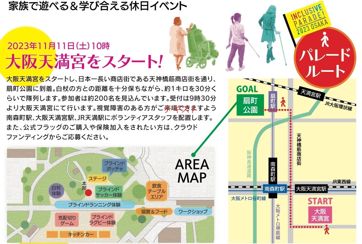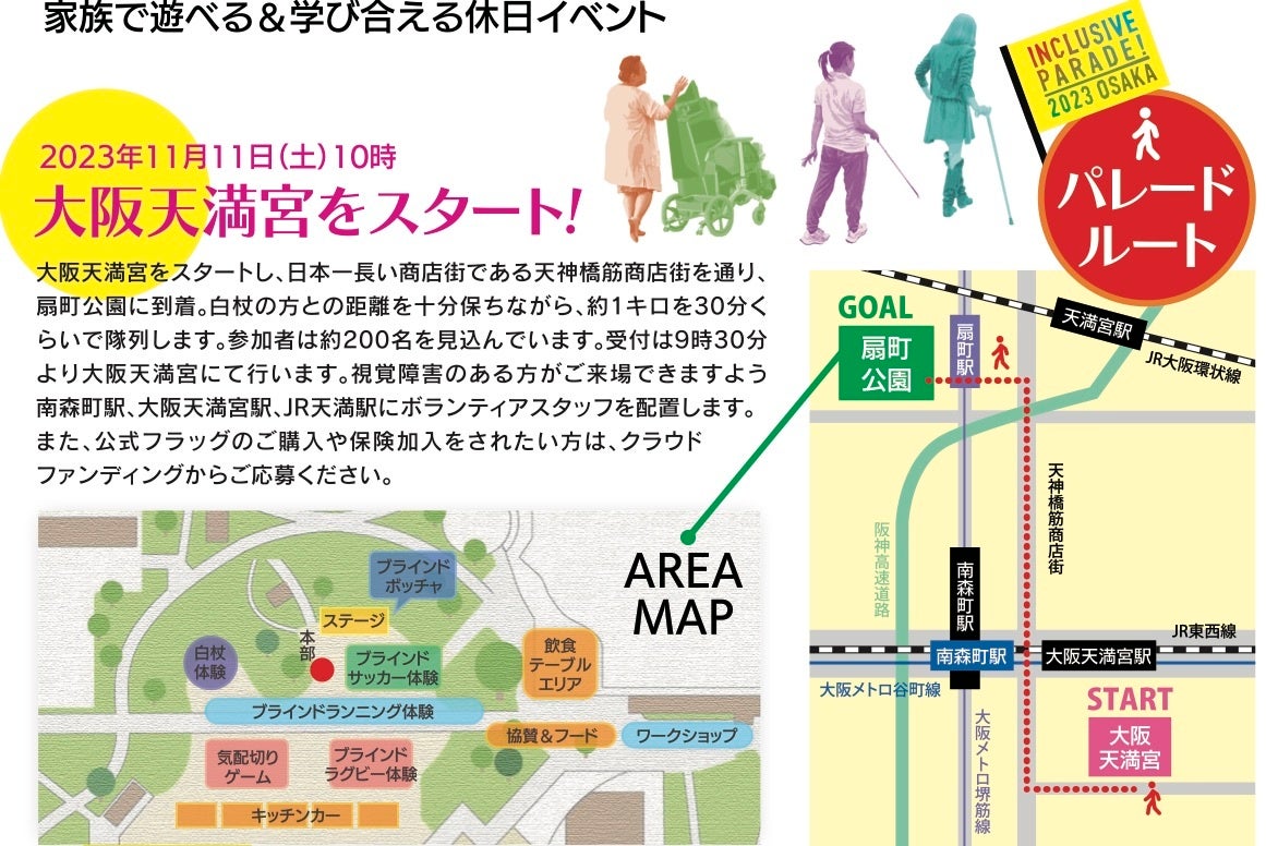 『インクルーシブパレード2023 OSAKA』は、「障害があってもなくても友達になろう」をコンセプトに、インクルーシブデザインを用いて企画した日本最大規模のイベントです。第2回目となる今年は、視覚障害者である白杖使用者や見えない、見えにくい方にスポットを当てて、障害のあるなし関係なく、ともに集まり、みんなでパレードを実施します。パレードのルートは、大阪天満宮をスタート地点として、日本一長い天神橋筋商店街を抜け、扇町公園までの約1キロを30分くらい歩きます。到着地点の扇町公園では、体験・交流型のイベントを開催します。当日は、大阪府警察による全面協力のもと、堺筋を一部通行止めにして、白杖使用者や車椅子使用者らとともに、大阪のど真ん中を練り歩きます。