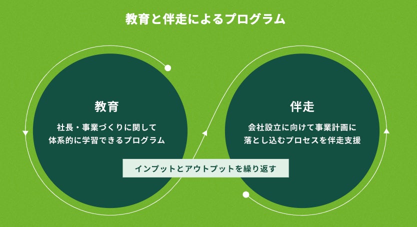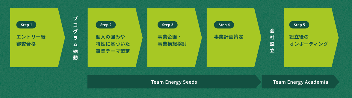 次に、「学び」と「事業計画」の並行。これが「Team Energy Seeds」の最大の特徴です。社長教育に特化した教育機関「Team Energy Academia と連動し、「学び」を体系的に吸収するプログラムを提供しています。そのうえで、会社設立に向けた「事業計画」に落とし込むプロセスを伴走支援する体制を両立しています。