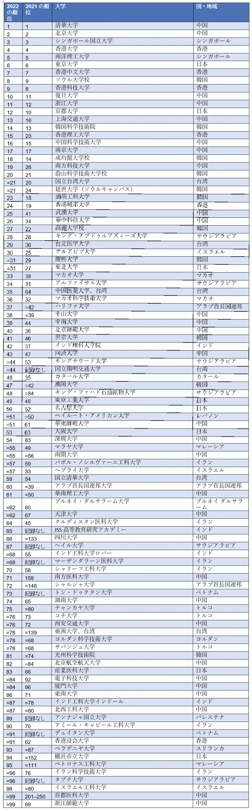 Asian University Rankings 2022 https://www.timeshighereducation.com/world-university-rankings/2022/regional-ranking Click here for the evaluation method of the Asian University Rankings 2022 https://www.timeshighereducation.com / world-university-rankings / asia-university-rankings-2022-methodology