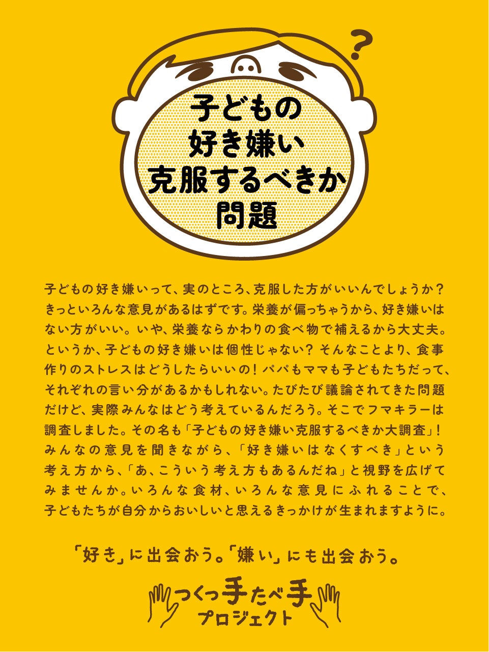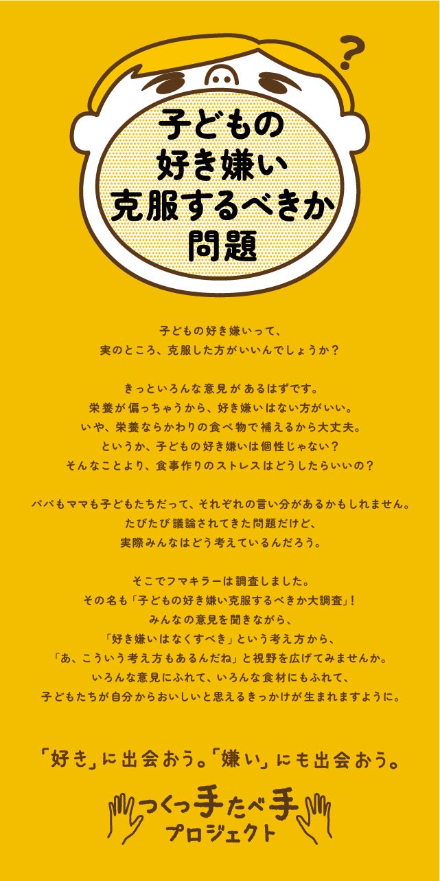 つくっ手たべ手プロジェクト第二弾は、子ども×食育に関する疑問を世の中へ問いかける みんなは好き嫌いを克服すべき派?克服しなくてもいい派?『#子どもの好き嫌い克服するべきか問題』本日よりスタート!!