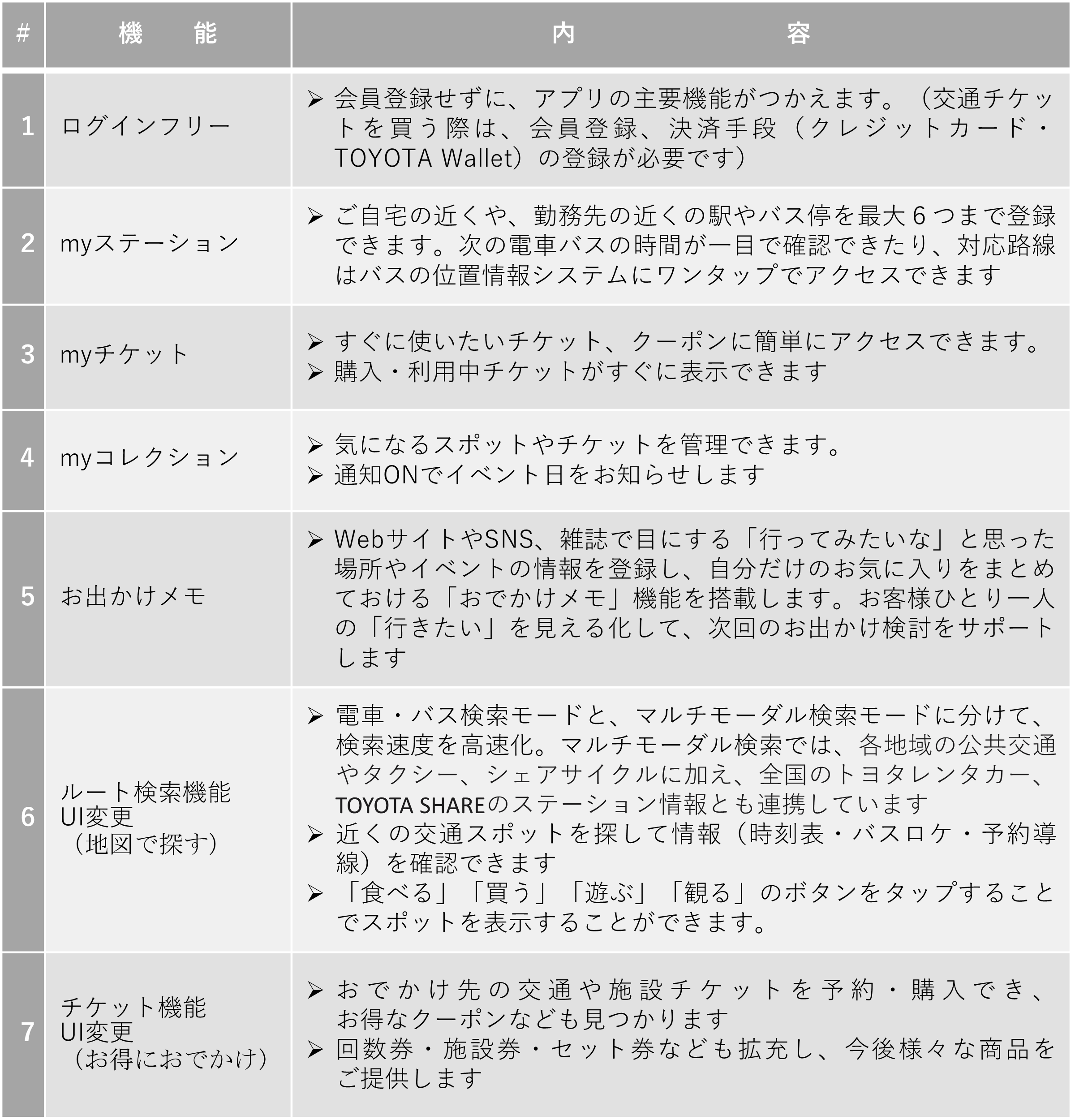 日々お寄せいただいているお客さまからの声に基づき、使い勝手を、一から見直し、利用頻度が高い機能・サービスのインターフェースを刷新。「おでかけメモ」、「myステーション」といった新機能を設置し、お客様に毎日使って頂けるアプリを目指しております。また、会員登録なしで、すべての機能にアクセスできるようになりました。(チケット購入には会員登録と決済手段の登録が必要となります)