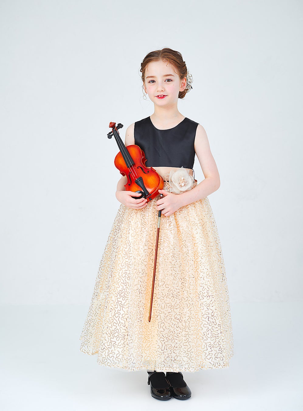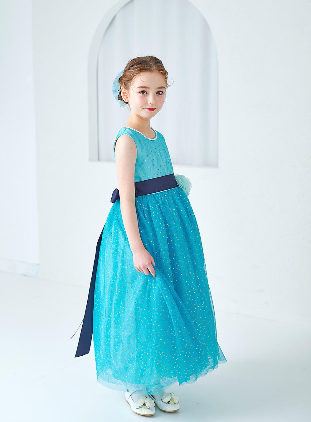 キラキラと輝くゴールドラメが散りばめられたエメラルドブルーのドレスです。ネックラインに施された装飾と、ウエストにあしらわれたフラワーコサージュが華やかさをプラス。色調は上品で、発表会やコンクールでも派手過ぎず、かつ存在感を発揮します。