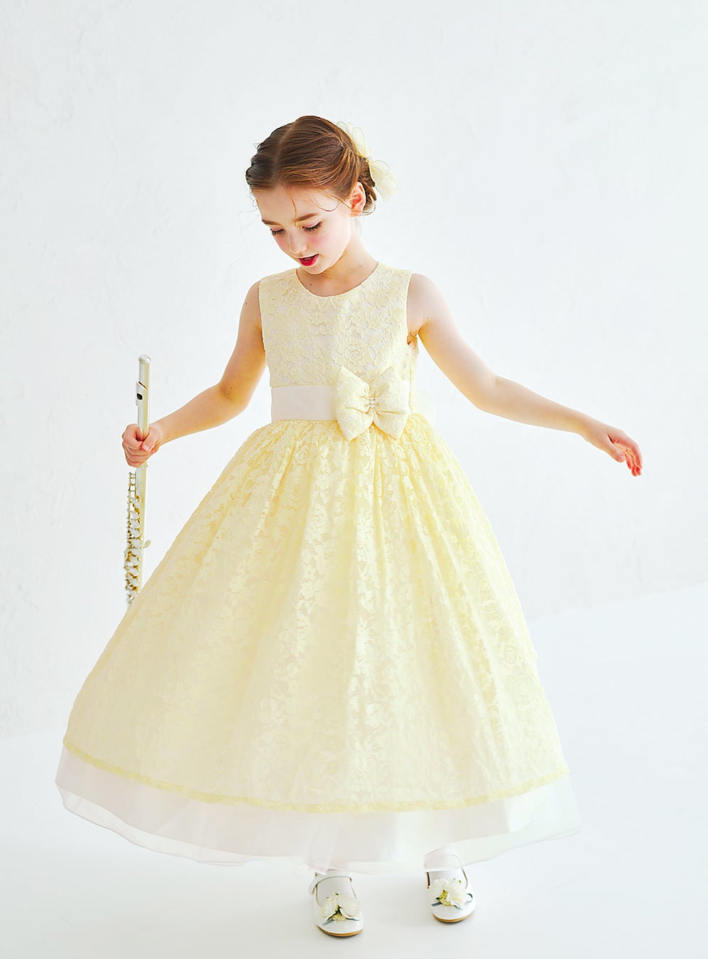 上品なイエローカラーにフラワー模様のケミカルレースを贅沢に使用した、高級感溢れるフォーマルドレスです。