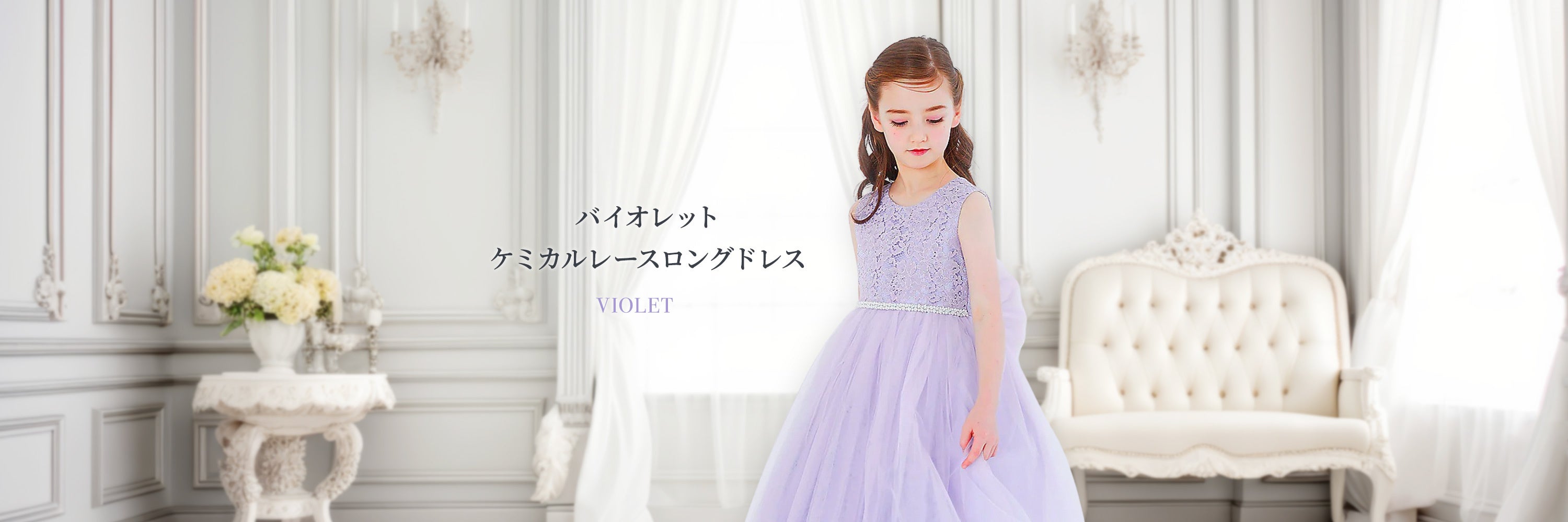 光沢感溢れるバイオレットのサテンに、お花模様のケミカルレースをあしらった、一目で目を引くドレスです。スカートには、淡いバイオレット色のソフトチュールを採用しており、洗練されたがガーリーな印象を与えます。