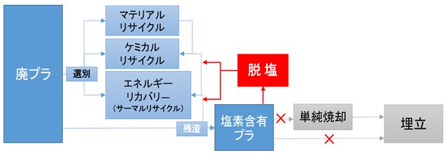 これまで単純焼却や埋立処分されていた塩素系プラスチックが、塩素低減されることでケミカルリサイクルやサーマルリサイクルへとリサイクルの高度化に繋がると考えています。