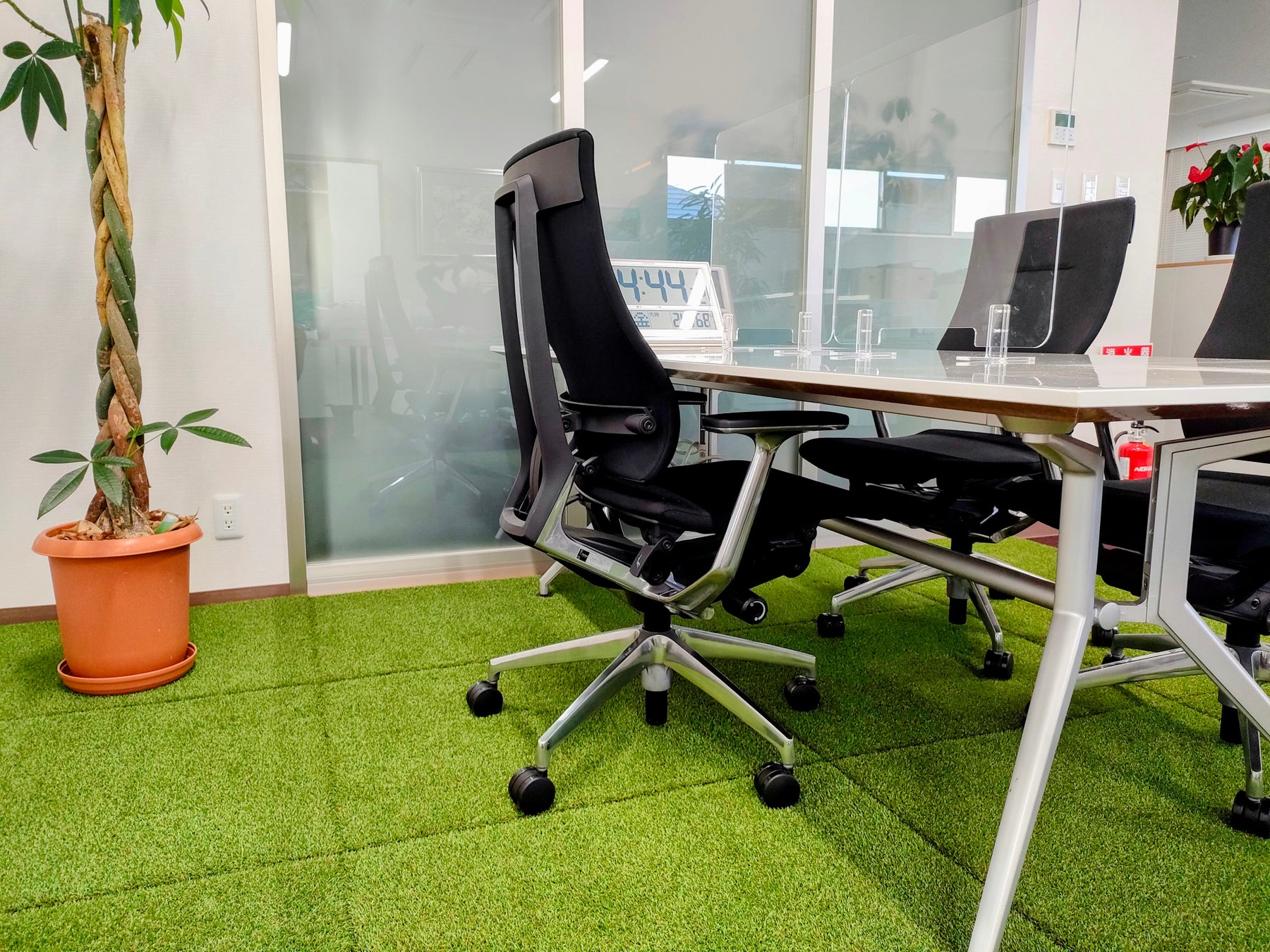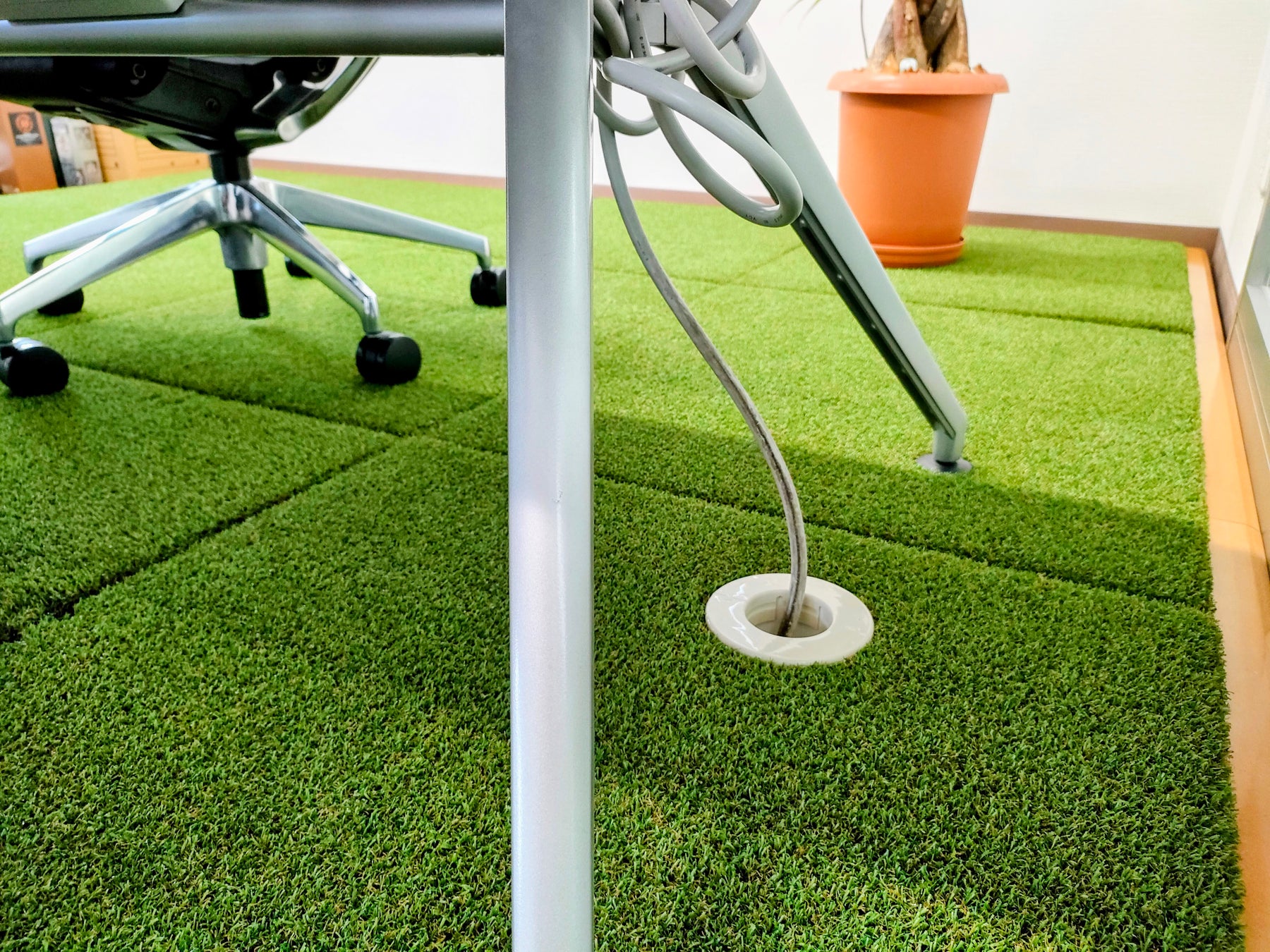 この商品はオフィス家具をそのままに、マットのように下に敷くだけで適度なクッション性と緑の開放感を実現することができます。そして、大切なゲストを足元からおもてなしすることができます。商品は半畳サイズの組み合わせで、2畳からの規格サイズの他、お部屋ごとに採寸してオーダーメイドで作ることができます。商品の厚みは、本格サイズの50ミリの他、段差を最小限にした27ミリもあります。