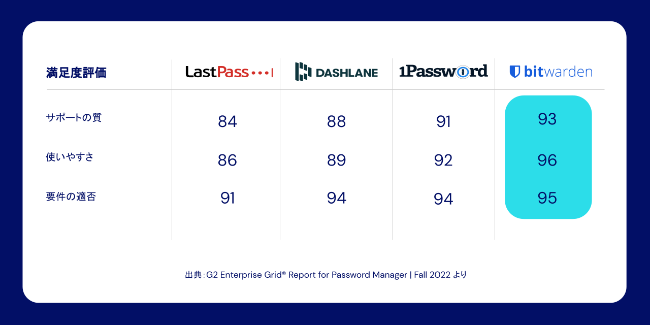今回Bitwarden は、パスワード管理ツール部門においてユーザーの100%がBitwardenを5つ星のうち4点と評価し、ユーザーの高い評価と製品に対する満足度を獲得しました。また、とりわけBitwardenの機能において、パスワードジェネレーターが満足度97%、二要素認証が97%、マルチデバイス使用が96%と、最も高い評価を受けました。G2のアワードは、実際にソフトウェアを利用しているユーザーによるG2レビューフォームの回答に基づいています。以下のチャートは、Bitwardenと主要な競合製品が獲得したスコアの比較です。