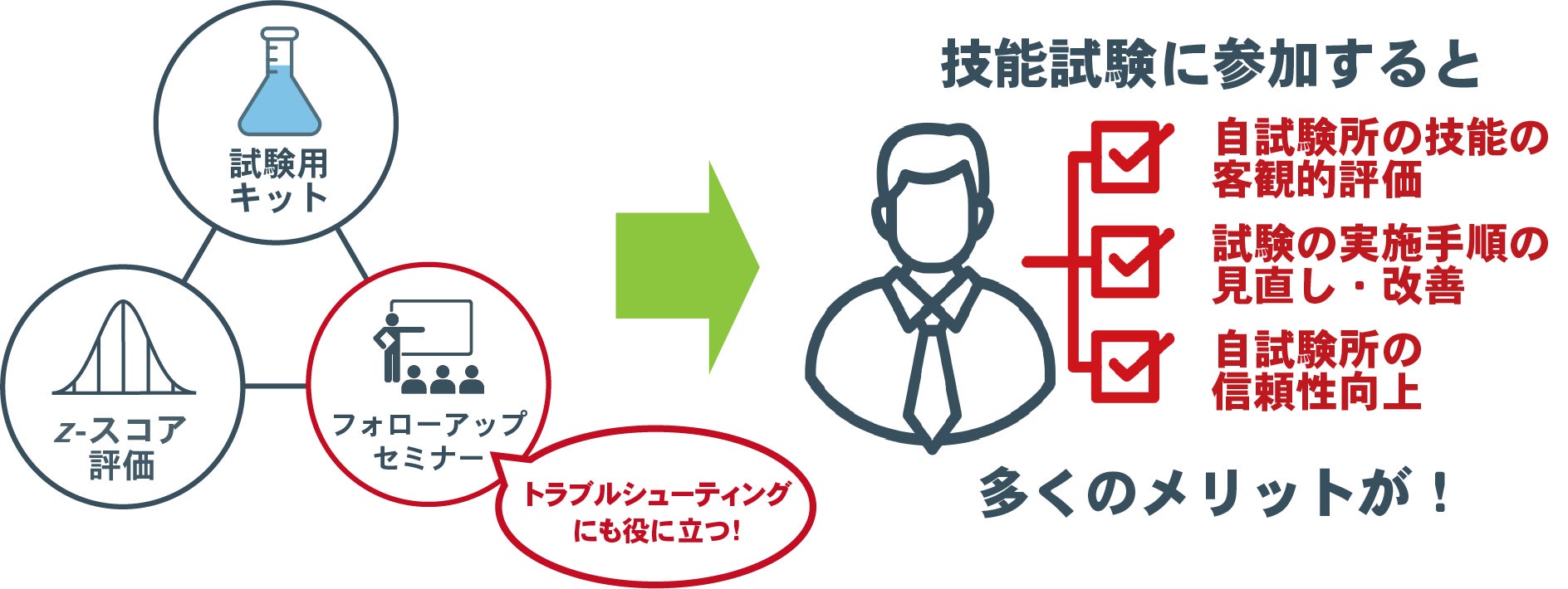 「試験」と言うと構えてしまうかもしれませんが、日常業務の振り返りの一環として位置づけられているのが試験所間比較による技能試験です。たとえ結果が芳しくなかった場合でも、業務手順等を見直し是正して次年度以降に再受検することで満足のいく結果が得られ、自試験所の信頼度が一段と高まります。技能試験の目的は、その結果を踏まえて業務の確認・改善を行うことです。