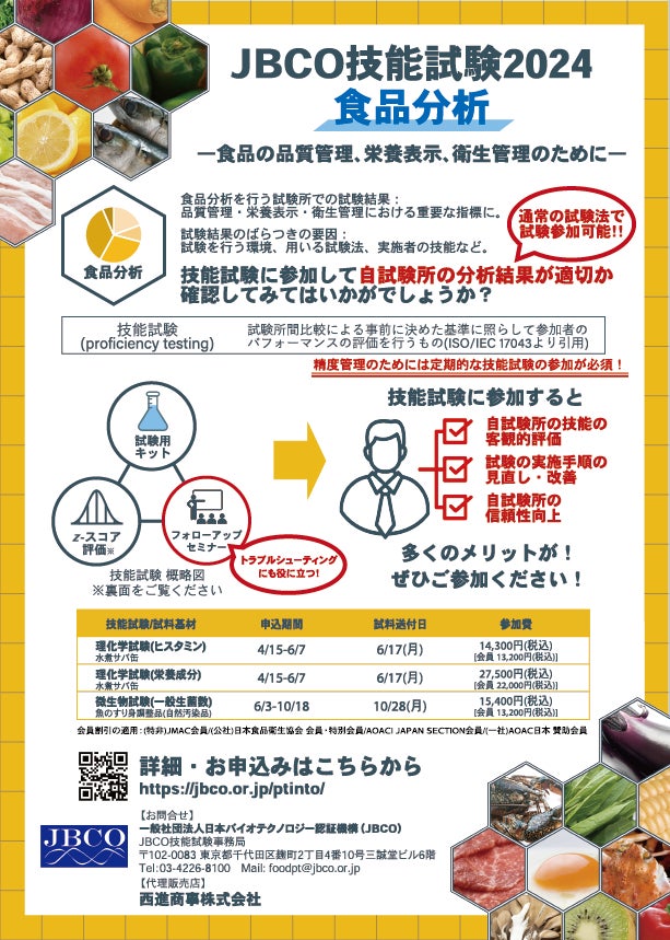 一般社団法人日本バイオテクノロジー認証機構(東京都千代田区、代表理事:中江裕樹)は、食品分析の技能試験プログラムを提供しています。2024年度プログラムのうち、理化学試験の試験項目(ヒスタミン・栄養成分)のお申込みの受付を4月15日より開始します。