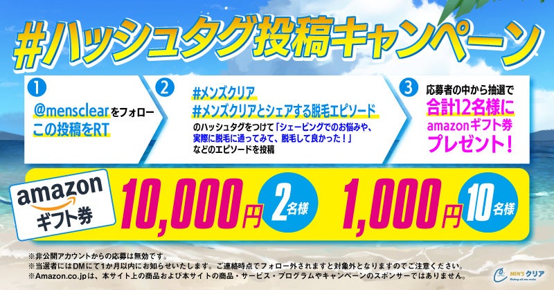 「#メンズクリア」「#メンズクリアとシェアする脱毛エピソード」をつけて投稿していただいた方の中から抽選でAmazonギフト券を12名様にプレゼント!