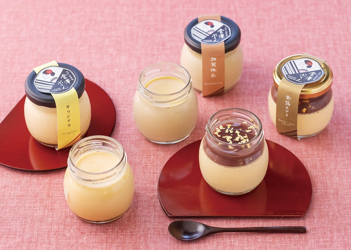 かつて茶屋街としてにぎわった町並みが今も残り、重要伝統的建造物群保存地区として指定される「ひがし茶屋街」。『金澤ぷりん本舗』は、茶屋街のシンボルでもある町家で、バラエティー豊かなぷりんを楽しめる人気店です。店内の工房では丹精込めてぷりんが作られており、絹のようになめらかでとろける口当たりは、試行錯誤を繰り返してたどり着いた奇跡の食感。原料には、能登半島鳳珠郡能登町の牧場で自家産牧草を食べ、のびのびと育ったホルスタイン種のしぼりたて牛乳「のとそだち」のほか、能登の塩や加賀棒茶など、厳選した地元素材を中心に使用しました。金沢の歴史と地元素材の風情が楽しめる人気フレーバー3種のセットです。