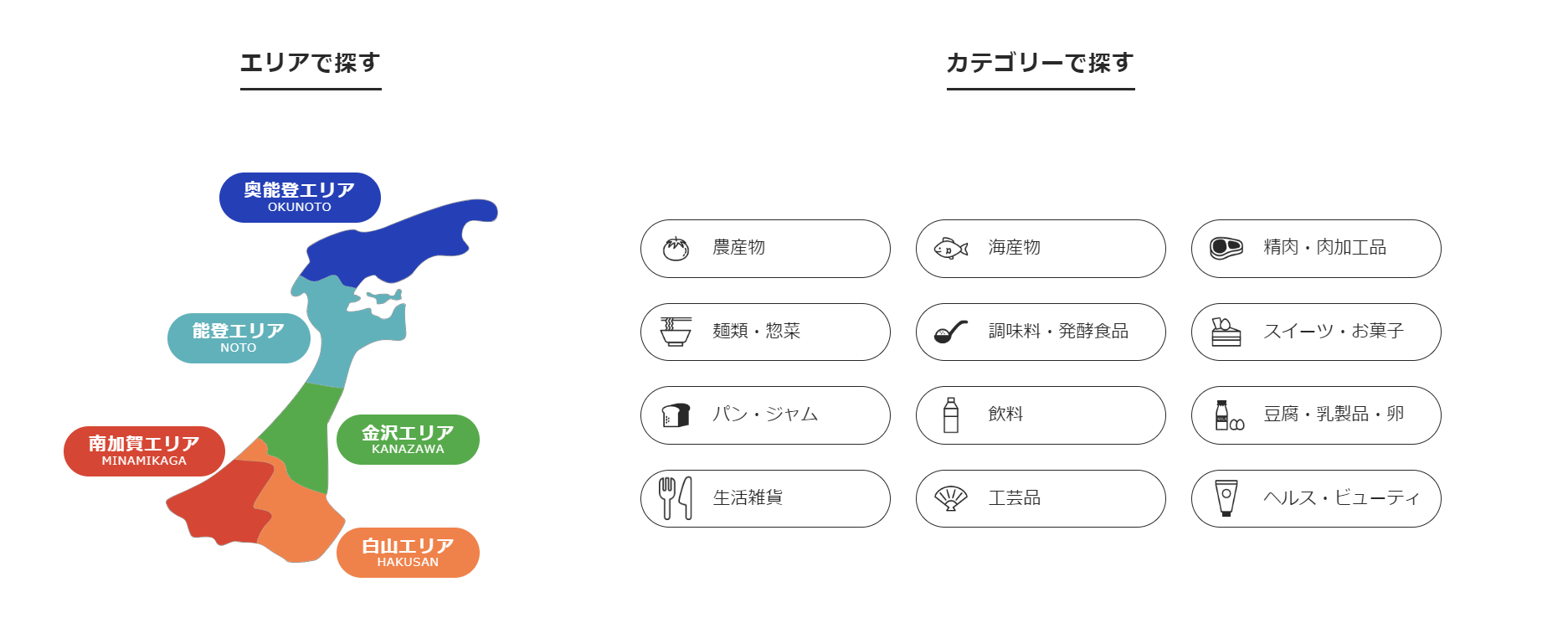 石川県は南北縦に長く、そこに根付く文化は風土もそれぞれです。「じのもんオンラインショップ」では、石川県を5つのふるさと(南加賀・白山・金沢・能登・奥能登)に分け、商品検索ができる機能を追加。また「農産品」「海産物」「精肉・加工品」など、欲しい商品カテゴリーでも商品検索ができます。ギフトシーンでの利用にも使いやすいよう、お歳暮やお中元、結婚・出産祝いなど利用目的に合わせた商品もあります。