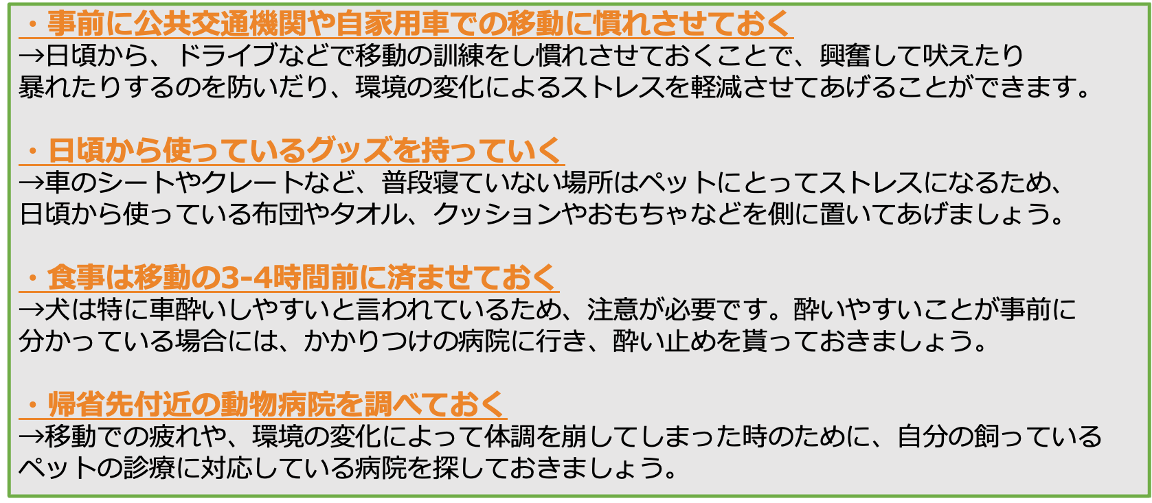 とはいえ、長距離の移動は少なからずペットにストレスを与えてしまうことになるため、少しでもストレスを軽減させるために、以下のような準備をすると良いでしょう。