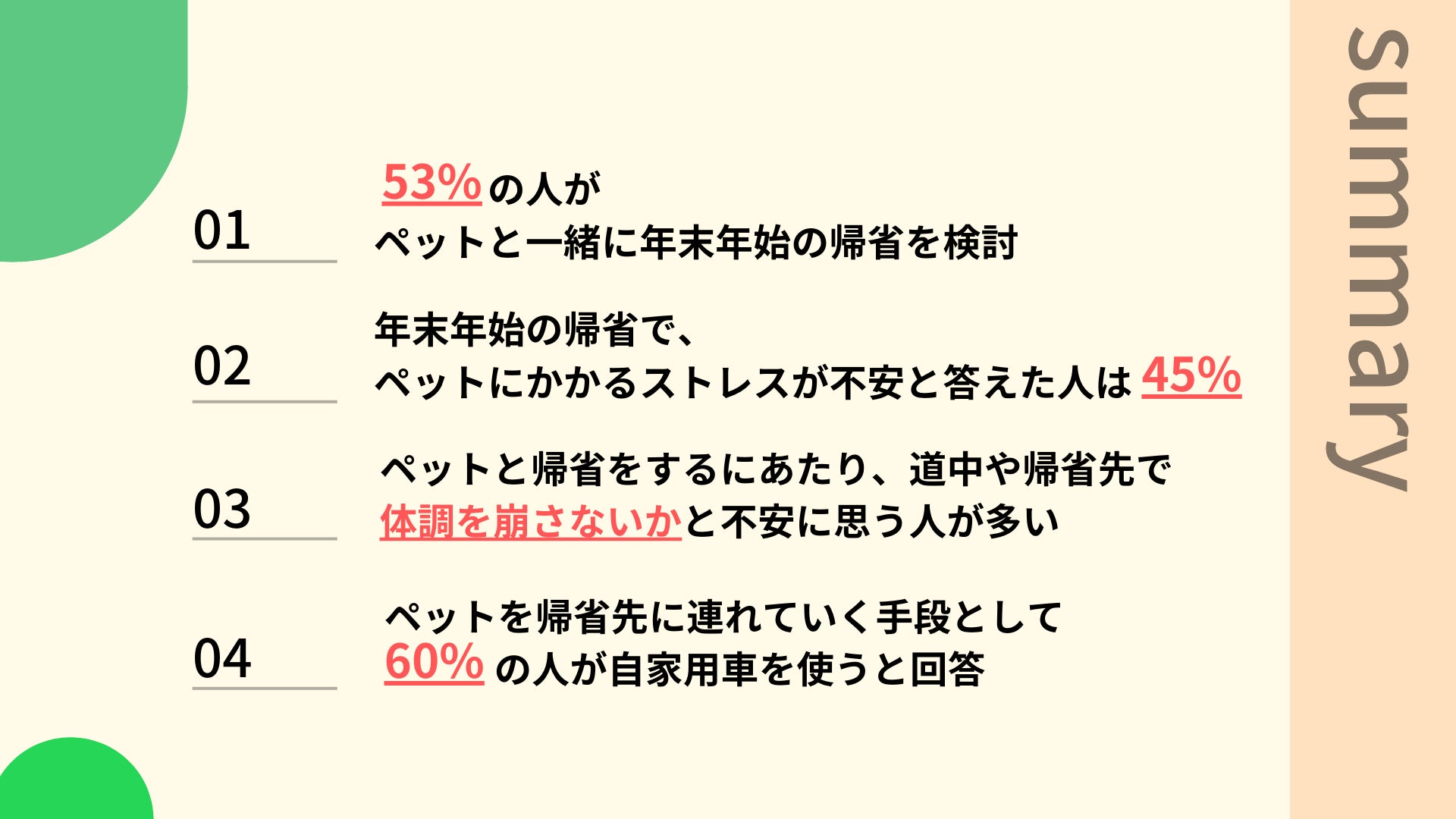 この調査を通じて、年末年始にペットを連れて帰省したいけれど、ペットにかかるストレスや、帰省先でのペットの体調変化を不安に感じている人が多いことが明らかになりました。