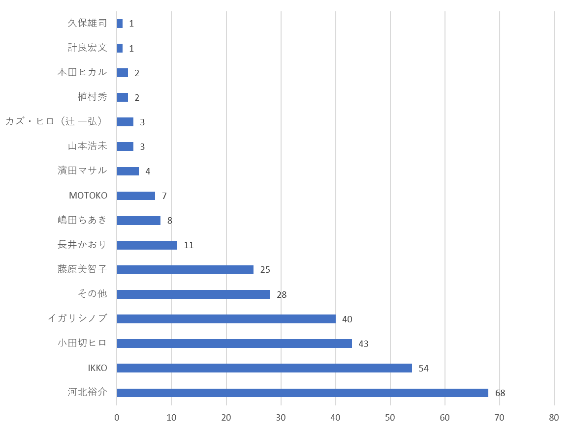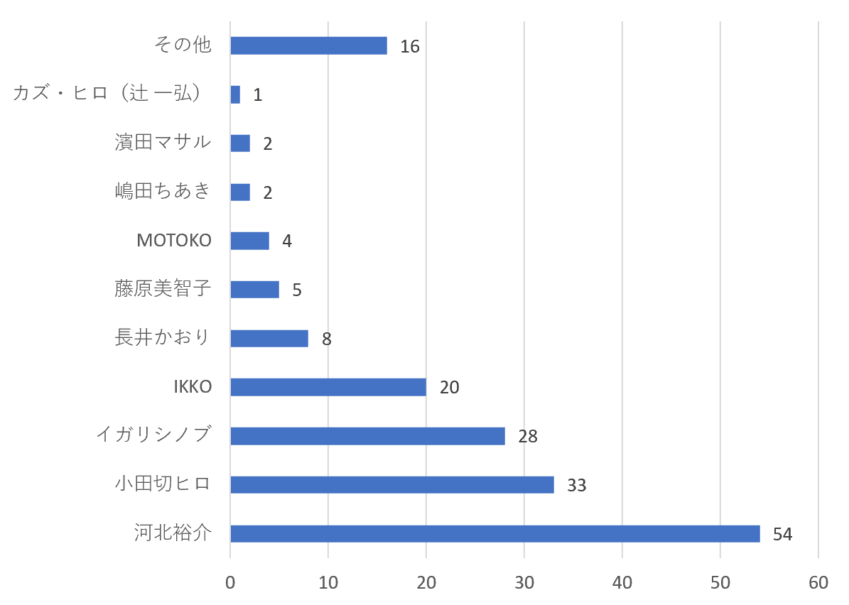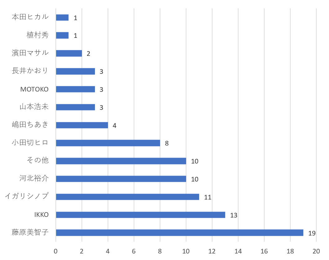 第1位は変わらず河北裕介さんですが、第2位に小田切ヒロさん、次いでイガリシノブさんがランクインする結果となりました。全体では第2位だったIKKOさんは20票で第4位となっています。