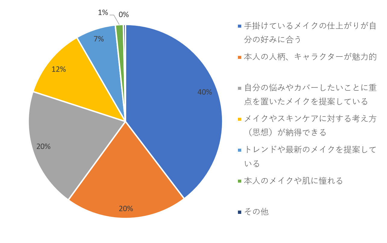 着目したいのは次いで挙がった「本人の人柄、キャラクターが魅力的」「自分の悩みやカバーしたいことに重点を置いたメイクを提案している」という項目です。それぞれ20パーセントを占めており、メイクアップアーティストを参考にするかどうかの鍵を握っているといえそうです。