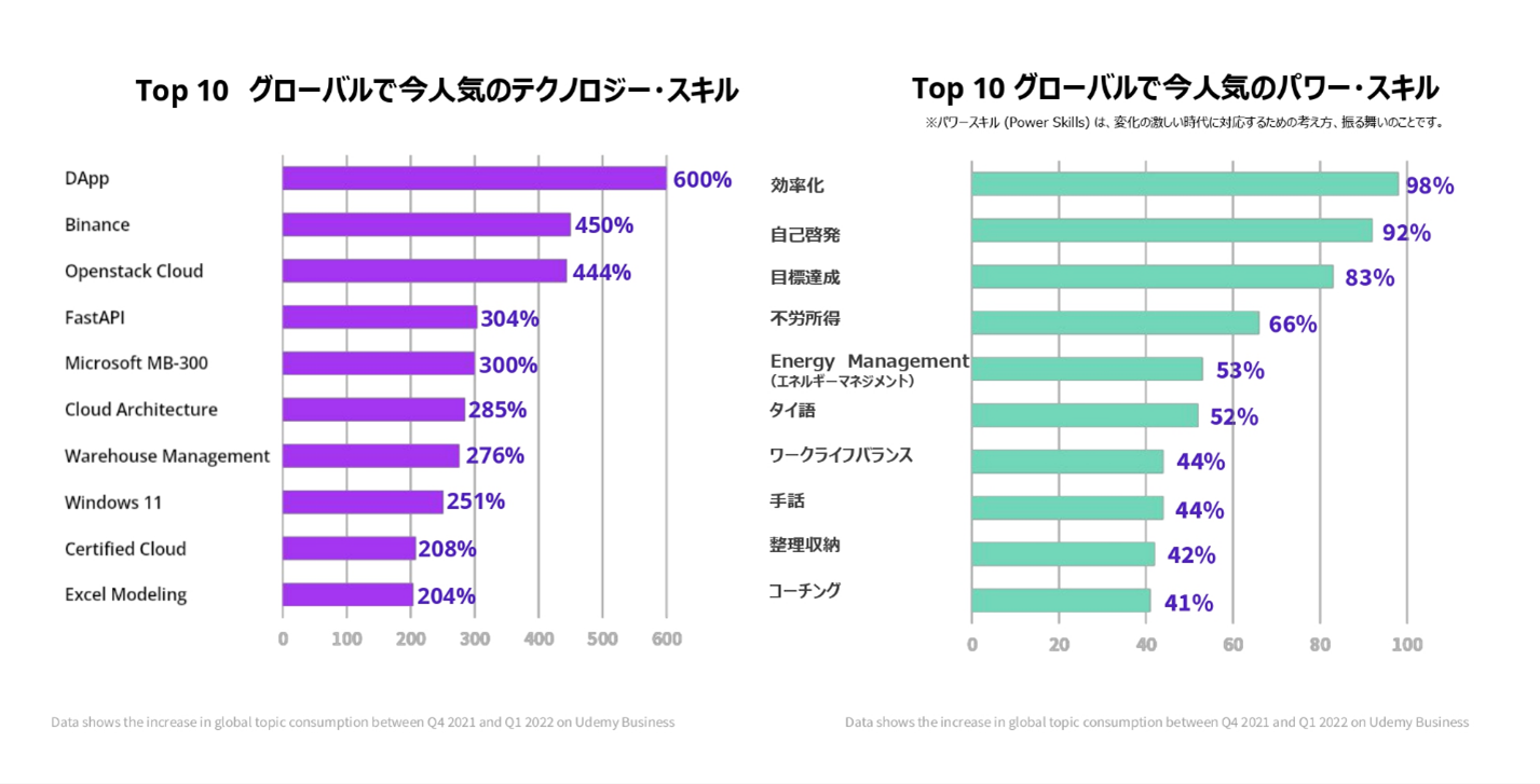 2022年現在、テクノロジースキルとパワースキルの分野では、それぞれ「ブロックチェーンの分散型アプリケーション」と「業務の効率化」に関する講座が世界中の学習者の間でトップを占めています。「DApp」や「Binance」といったブロックチェーン関連のテクノロジースキルは、2021年第4四半期と比較し利用率が450%以上増加しています。また、「効率化」(98%増)や「自己啓発」(92%増)といったパワースキルも、リーダーシップ能力を磨きたいとする人々の間で引き続き注目されています。
