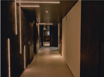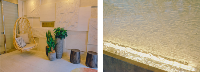 エントランスにはインスタスポットの他に、パネル内部で水が流れ落ちるアクアウォーターパネル(滝)を配し、視覚に響く空間です。エントランスからメイン通路にわたって、土壁・左官壁を用いて雨風で変化をもたらす地層をイメージし、凹凸のある地球の大地の質感を表現しています。
