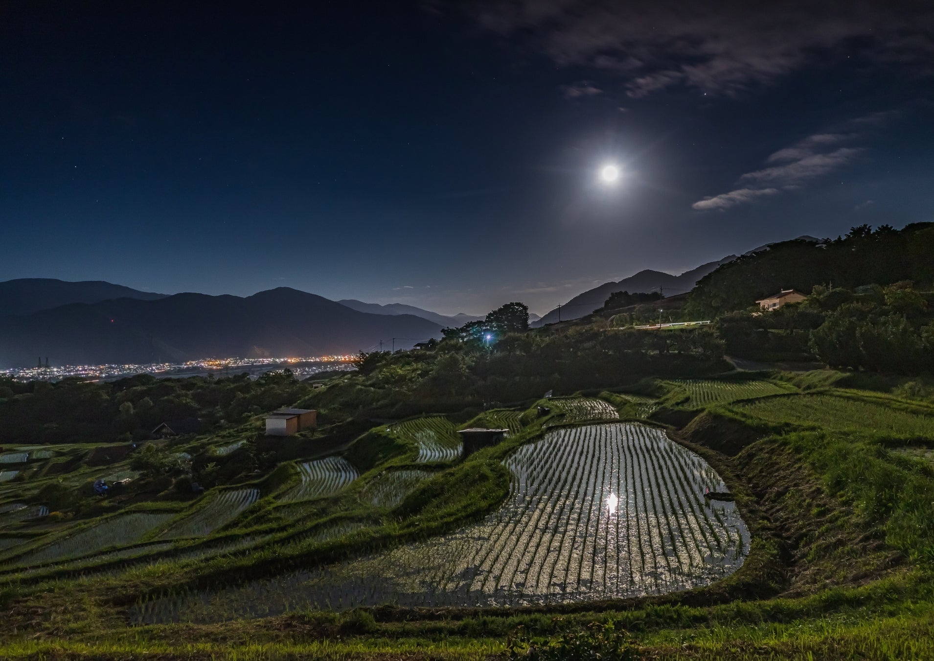 長野県北部の千曲市に在る、水田が幾重にも連なり形成された姨捨(おばすて)の棚田。