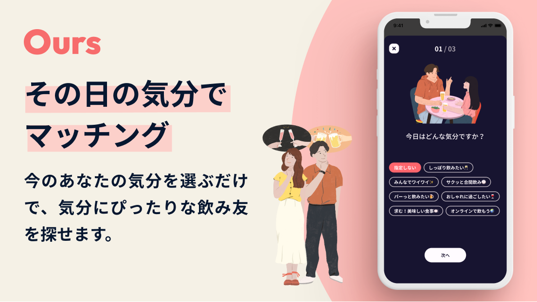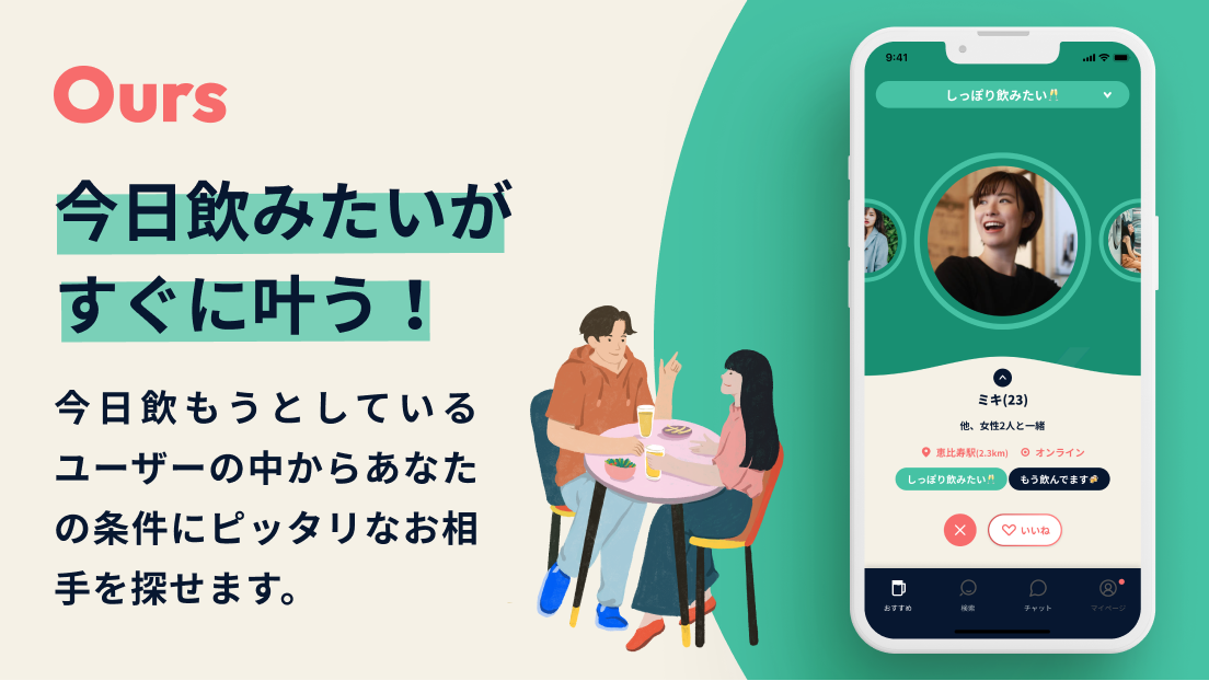 『Ours(アワーズ)』は、今日誰かと飲みたいというニーズに応える飲み友達マッチングサービスです。気分や条件を入力するだけで、その日に会える飲み相手を探すことができます。