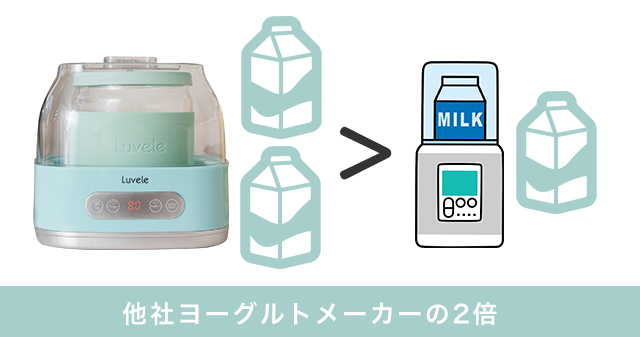 さらに一般的なヨーグルトメーカーが作れる量は、牛乳パック1本分(約1ℓ)程ですが、Luveleは約2倍の量(約2ℓ)を1度に作ることができます。