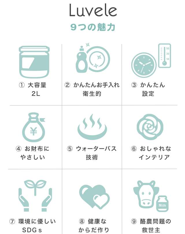 これまでのヨーグルトメーカーは、オシャレなものがなくキッチンに出しておきたいものではありませんでした。デザイン性に加え、機能的・衛生的に満足のいくものは国内になく大容量のものもありません。オーストラリア発のデザイン性と乳牛の本場の知識と技術が詰まったLuveleは日本に受け入れられる商品になると期待しております。