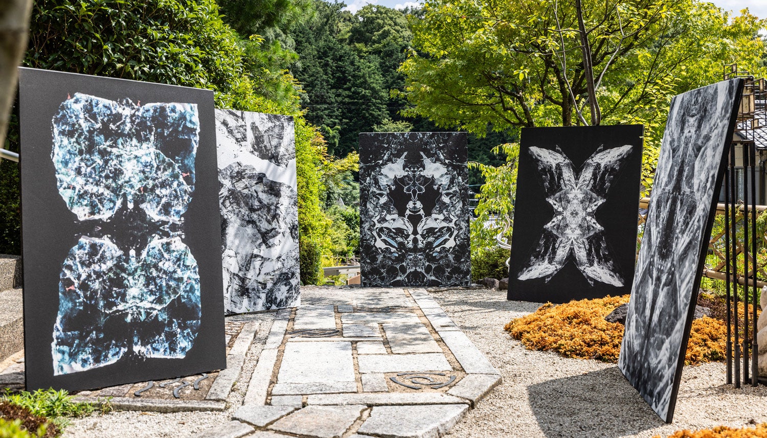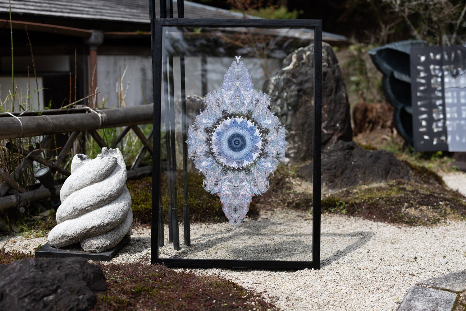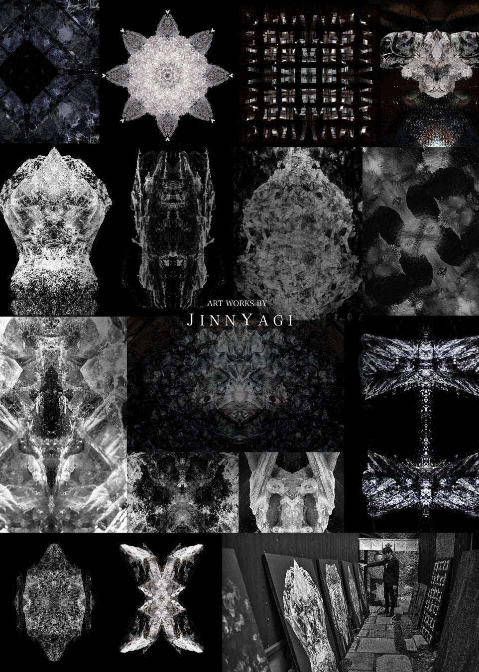 一方、八木ジンは異なる視点からアートに取り組み、写真や絵画を新たな形へと進化させることで、イメージの無限の可能性を探求している。彼の制作プロセスは、輪廻転生(サンサーラ)、すなわち「生」と「死」と「再生」のサイクルに対する視覚的な瞑想である。八木は写真画像を繰り返し反復させることで、複雑で対称的な模様、まるでマンダラのようなパターンを作り出す。この技法を通じて、一見ありふれた物体が新たな命を得る。例えば、車のテールライトがパラレルワールドへのポータルとなり、戦争する二つの国の国旗が幻想的な存在へと融合し、スクラップの鉄片が顕微鏡で見るステンドグラスのような模様を見せる。また、日常の断片に宿る美しさやカルマを発見させ、破壊の中にさえ解放の可能性が潜んでいることを示唆している。