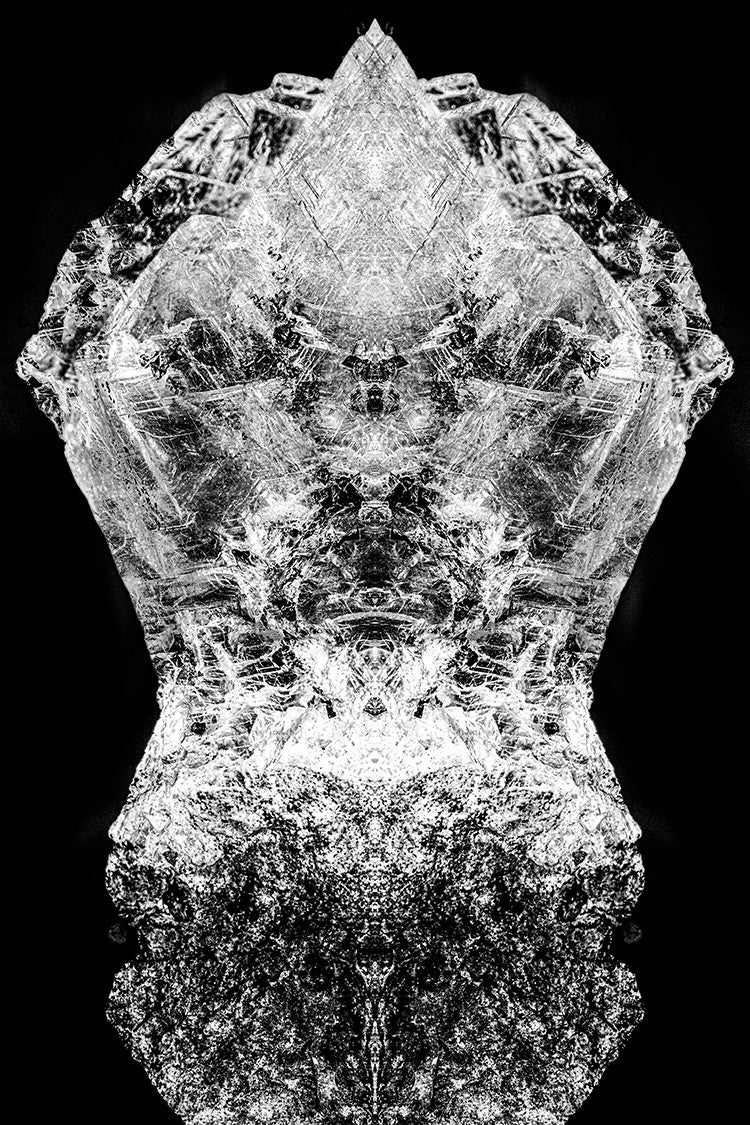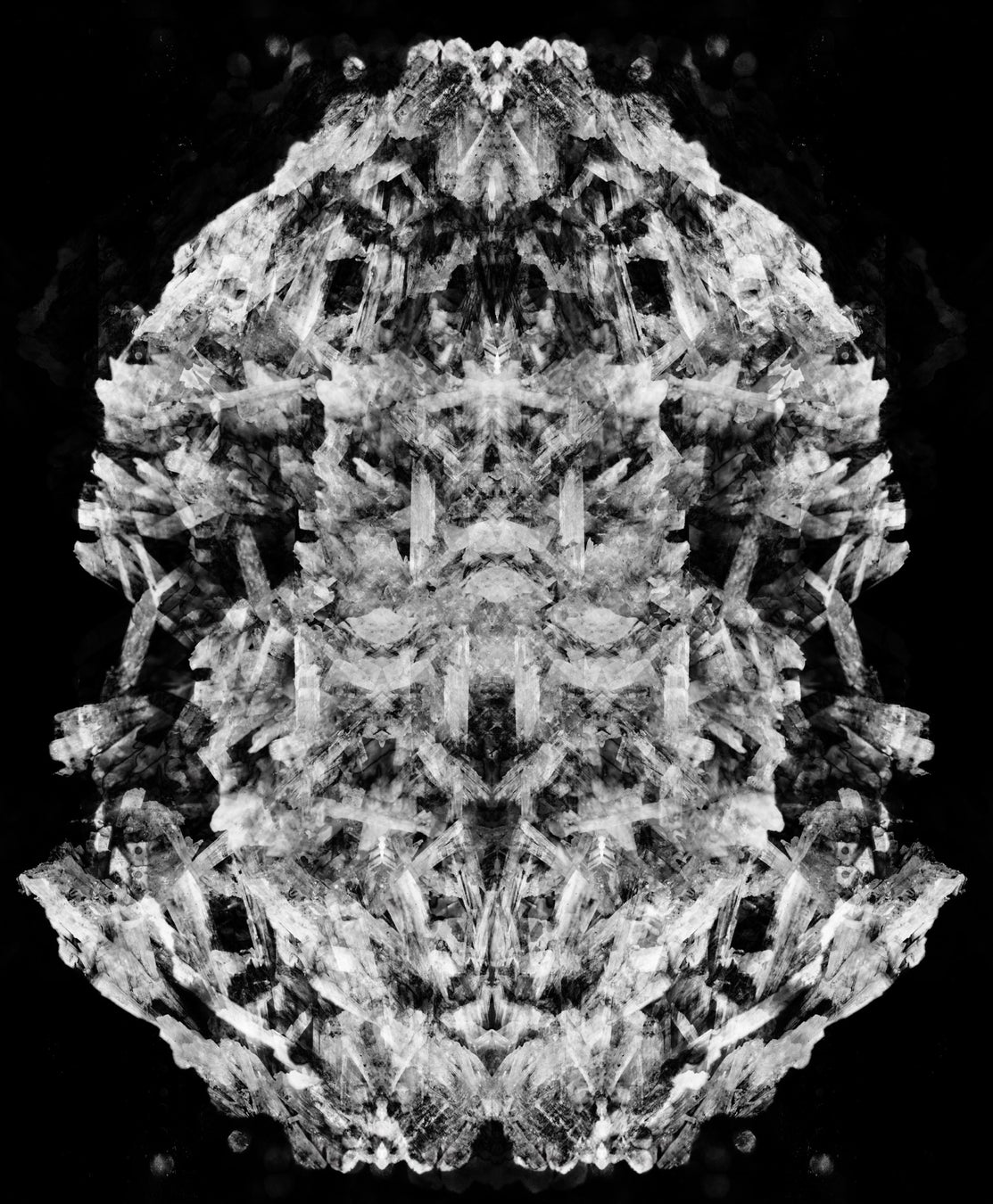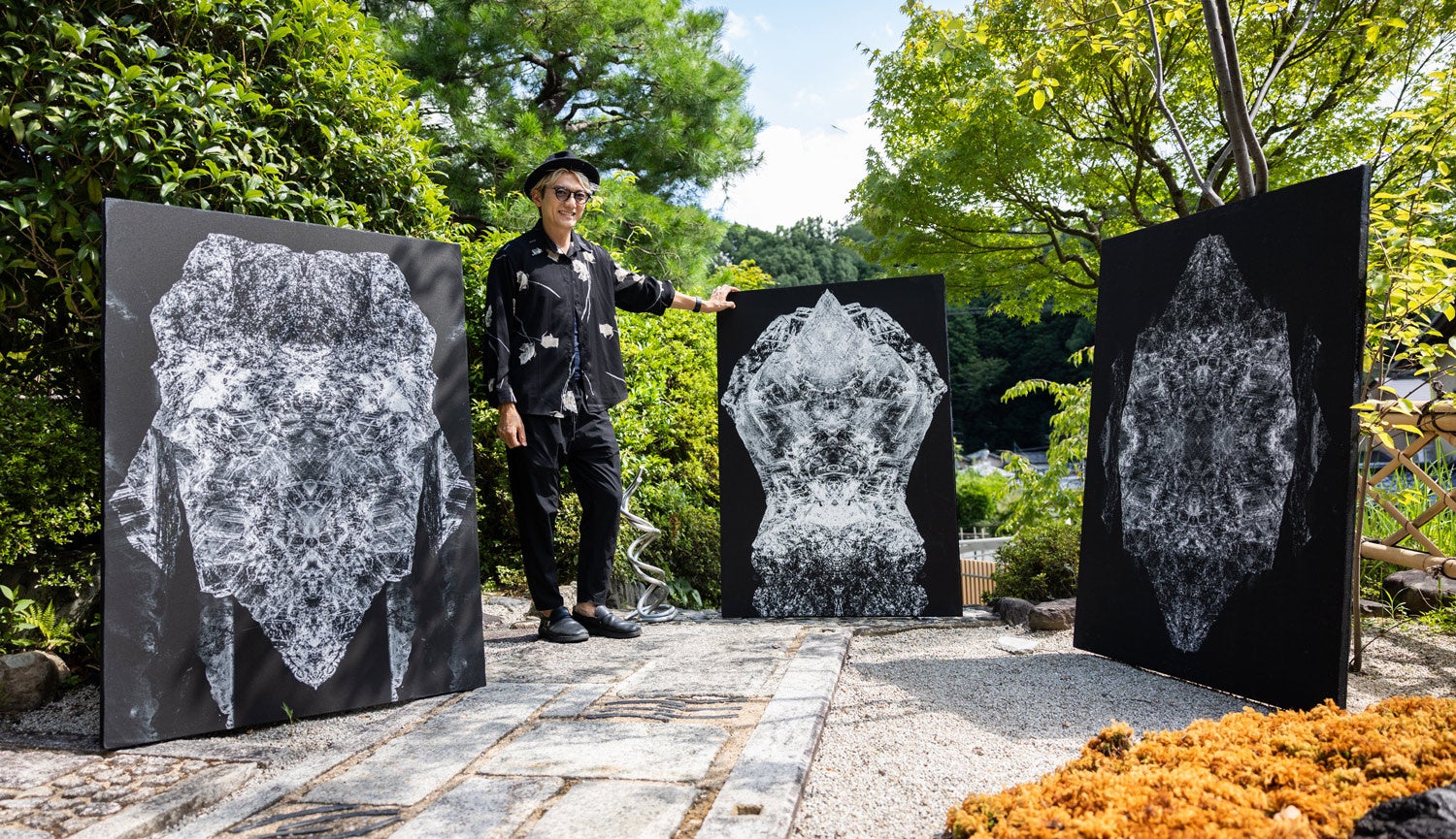 一方、八木ジンは異なる視点からアートに取り組み、写真や絵画を新たな形へと進化させることで、イメージの無限の可能性を探求している。彼の制作プロセスは、輪廻転生(サンサーラ)、すなわち「生」と「死」と「再生」のサイクルに対する視覚的な瞑想である。八木は写真画像を繰り返し反復させることで、複雑で対称的な模様、まるでマンダラのようなパターンを作り出す。この技法を通じて、一見ありふれた物体が新たな命を得る。例えば、車のテールライトがパラレルワールドへのポータルとなり、戦争する二つの国の国旗が幻想的な存在へと融合し、スクラップの鉄片が顕微鏡で見るステンドグラスのような模様を見せる。また、日常の断片に宿る美しさやカルマを発見させ、破壊の中にさえ解放の可能性が潜んでいることを示唆している。