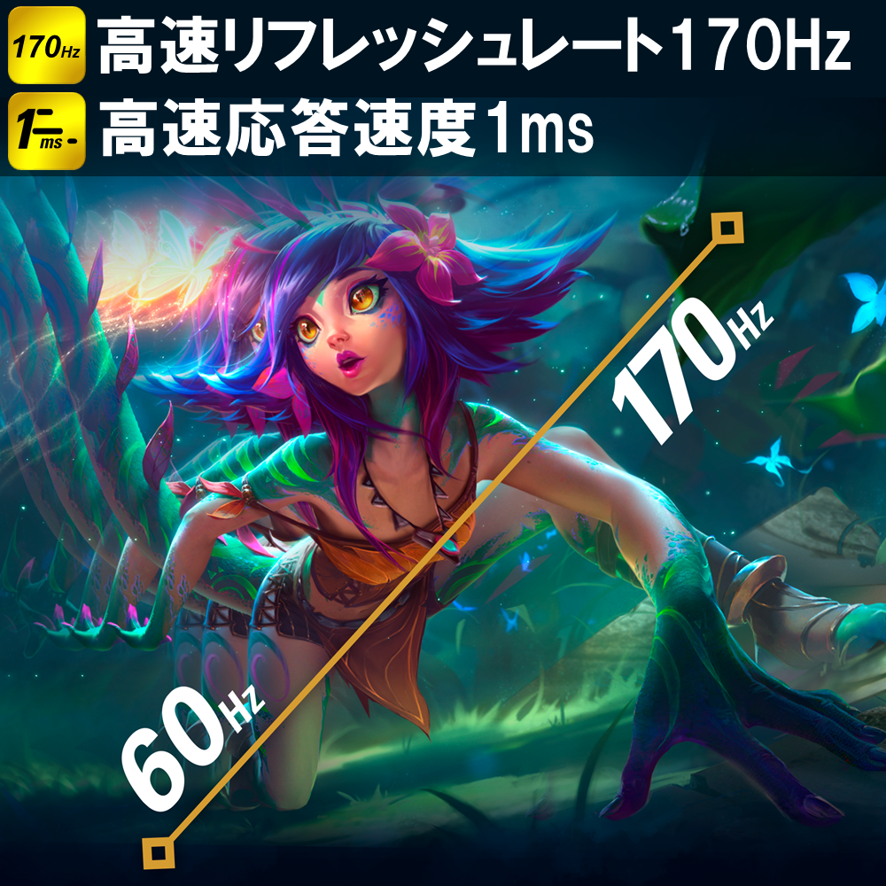 - 最大リフレッシュレート170Hz、最大応答速度1ms