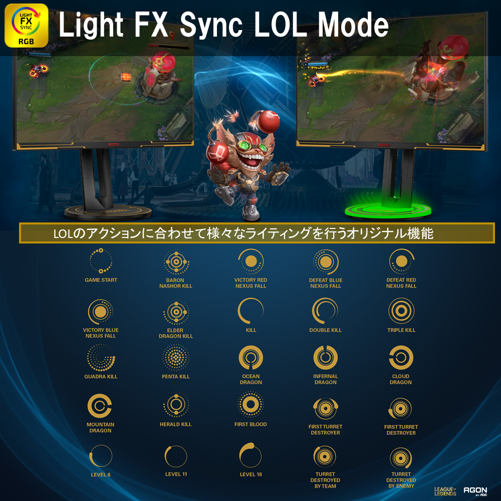 オリジナル機能として、LOLのアクションがモニタースタンドのLEDライトと連携し、様々な光り方を演出する「Light FX SYNC LOL Mode」を搭載、さらにゲームモード内にRiot Gamesと共同開発した「LOLモード」を備えております。