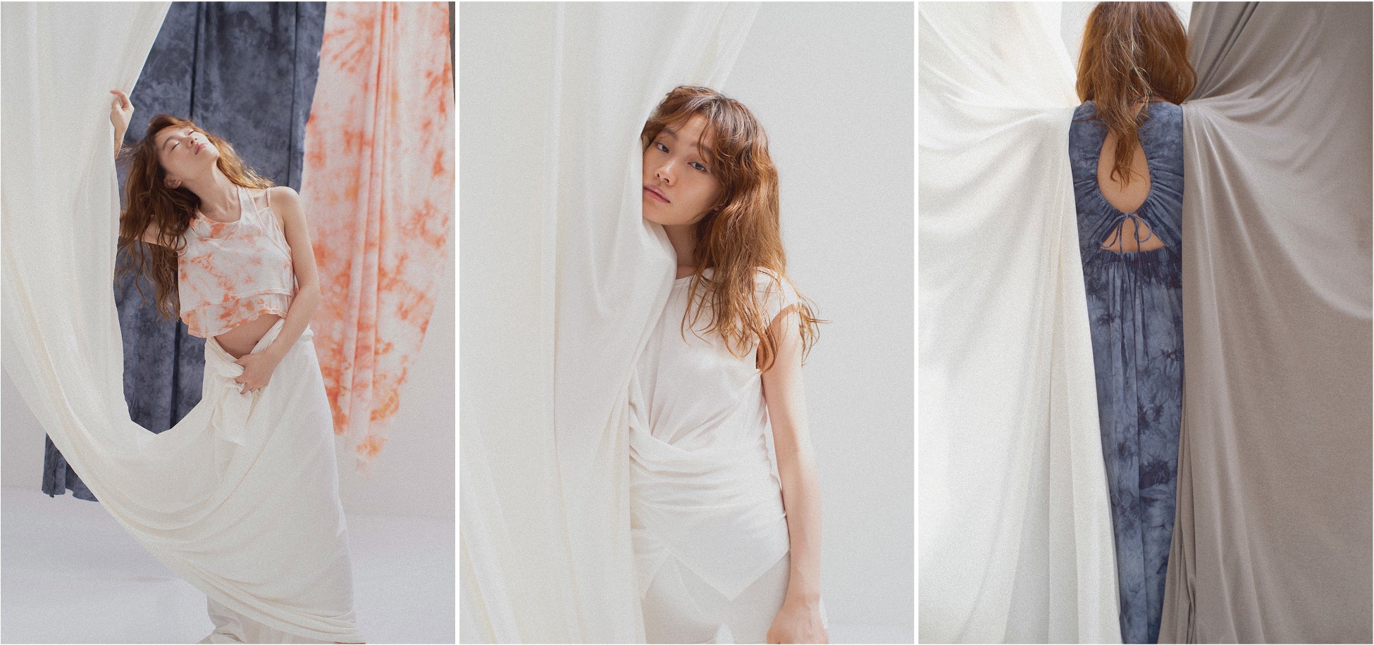 とうもろこしの繊維から再生されたポリ乳酸とオーガニックコットンを撚糸した生地を使用しデザインしました。