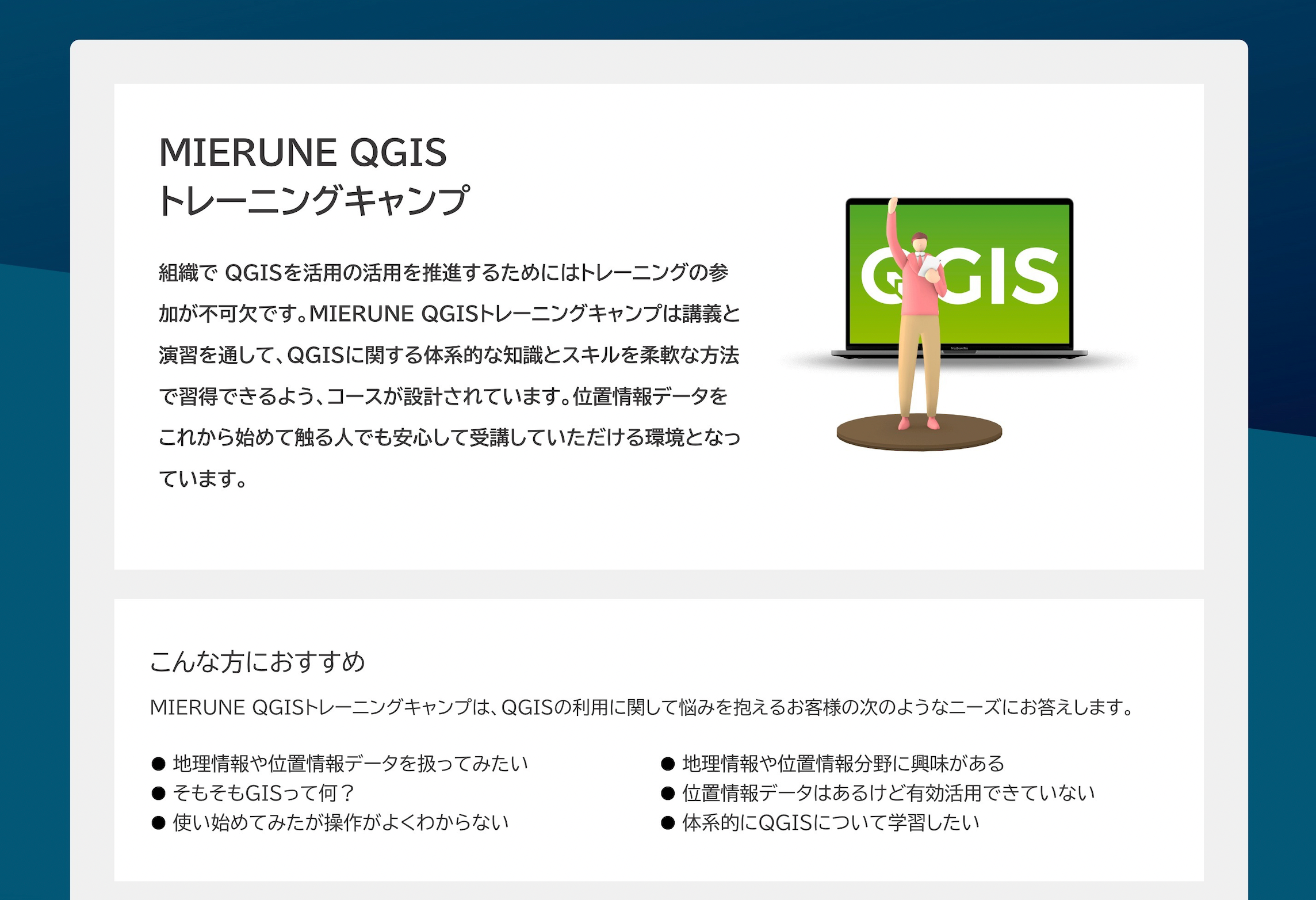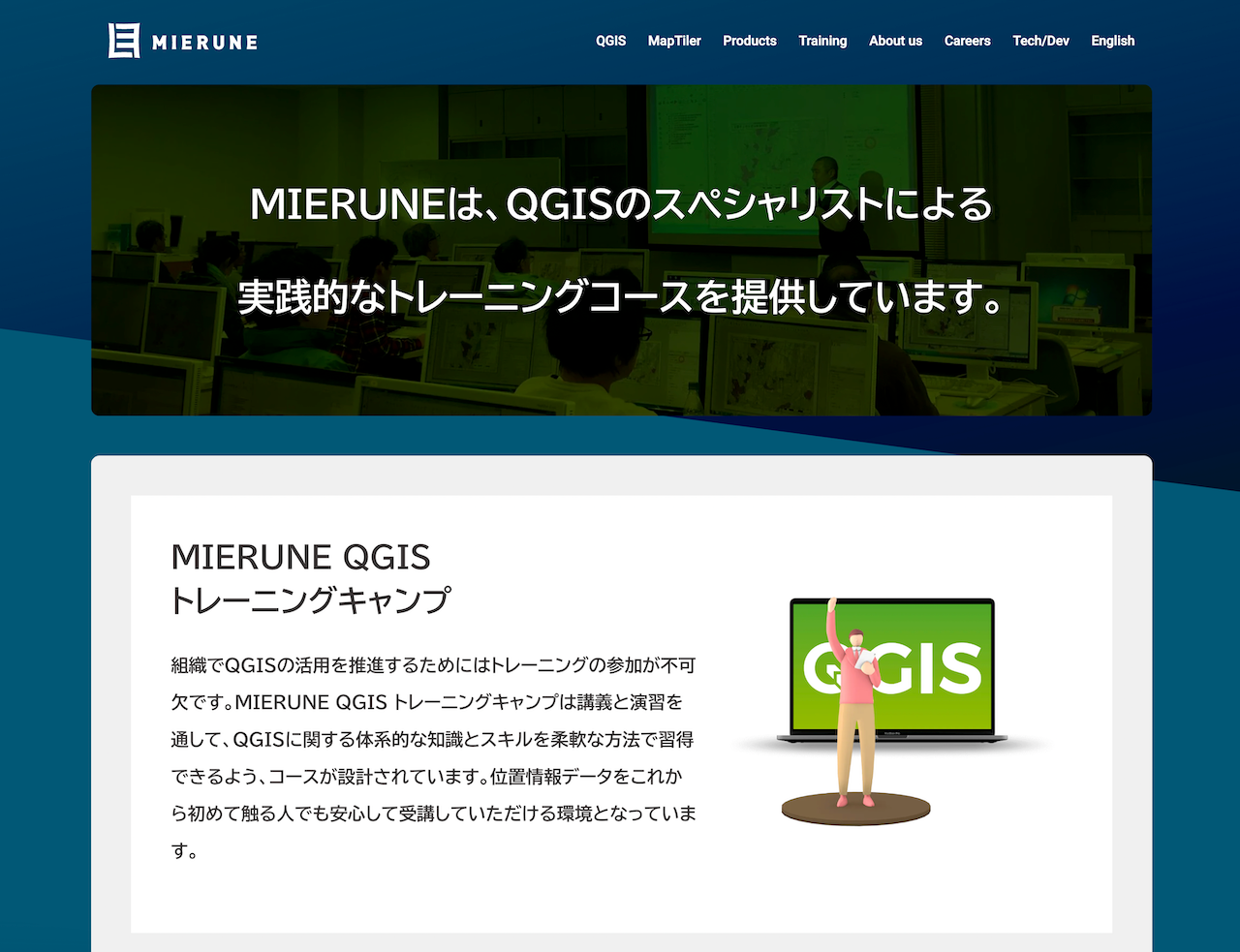 このような状況を踏まえ、MIERUNEはこれまで開催してきた「QGIS講習会」をリニューアルし、「MIERUNE QGISトレーニングキャンプ」として、HPに新たにページを公開しました。