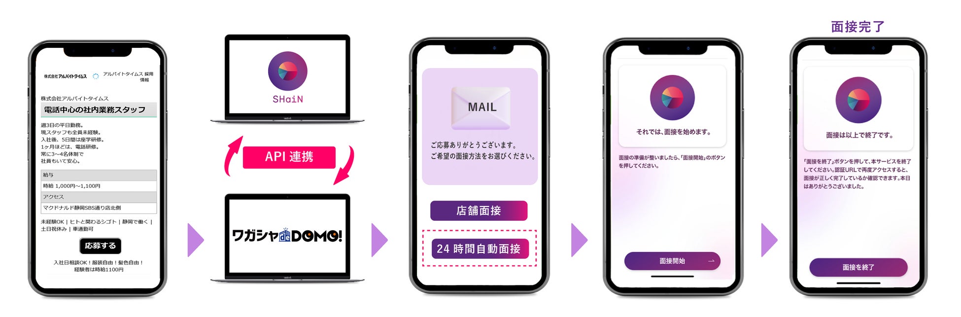 人手不足が深刻化し厳しい採用環境が続く中、応募者のニーズに合わせた採用方法が求められています。「ワガシャ de DOMO」と「SHaiN」連携のほか、アルバイトタイムスが運営する求人メディア「DOMO」「DOMO NET」「JOB」において「SHaiN」の利用が可能となり、応募者はどのメディア応募からもエントリー後すぐに面接が可能、24時間いつでも、どの場所でも面接ができるようになります。面接の日程調整がなくなることで応募者の心理的なハードルが下がり、応募後の離脱率を下げる効果が見込めます。