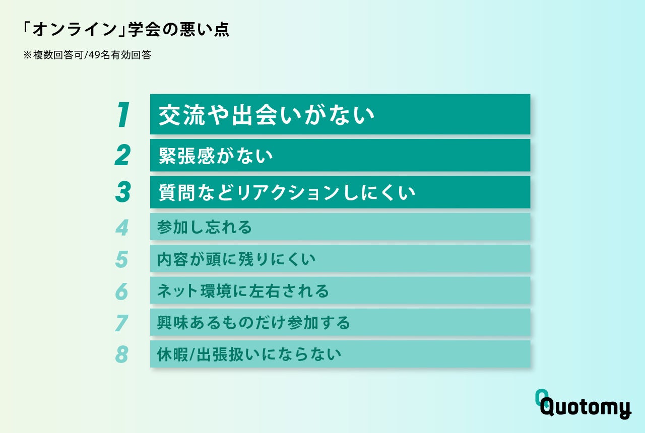 また、登壇者視点で「リアクションがわからない分やりづらい」や「プレゼンテーションの経験は積みにくい」など、発表意欲の減退を示すような回答もありました。オンライン特有のインタラクティブ感の欠如というデメリットは、医師自身も感じているようです。次点の課題として挙がった「緊張感がない」「質問などリアクションしにくい」などをみると、一方的な講義では学会の質の低下が引き起こされているのかもしれません。