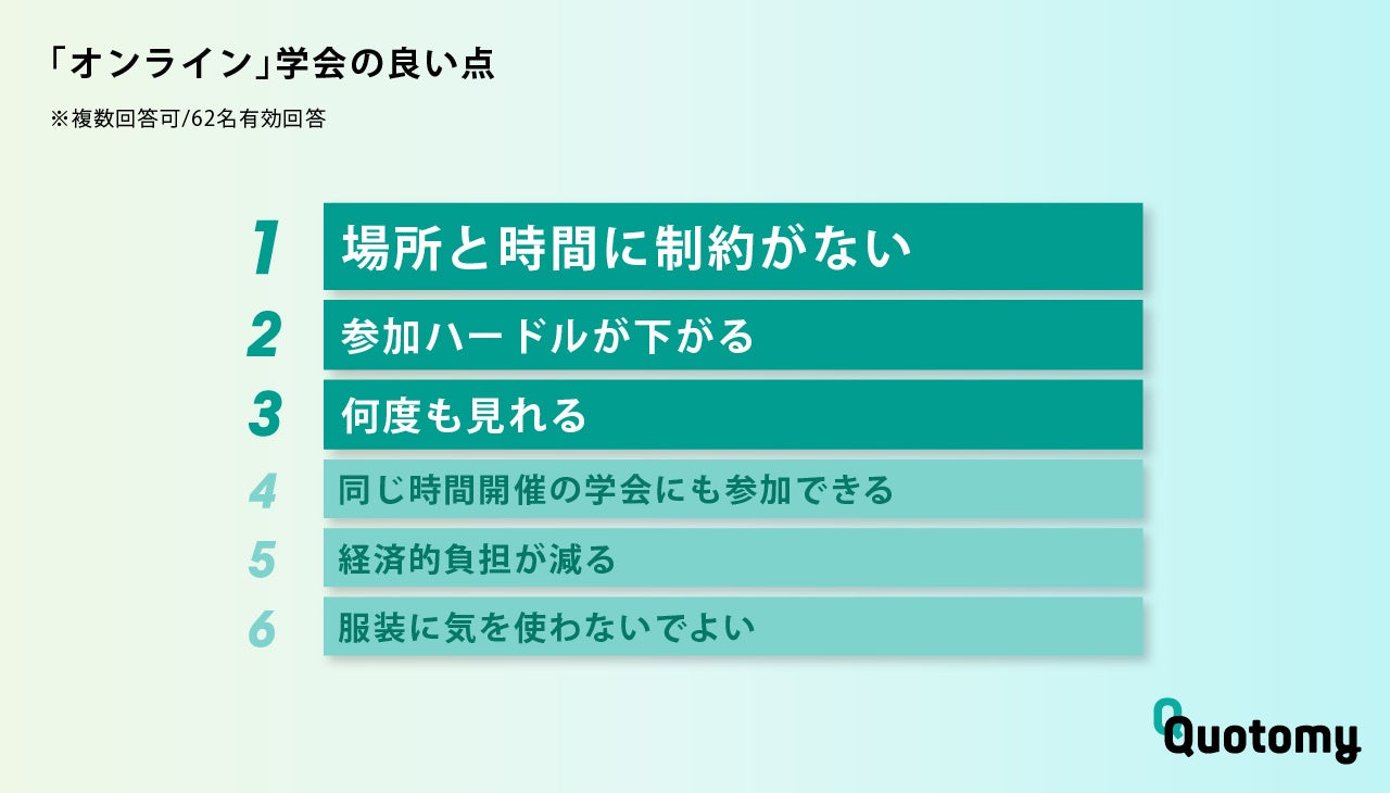 この結果からオンライン学会を長所短所どちらかのみで判断するのは難しく、医師個人が何を重要と考えるかで、回答が変わってきているのかもしれません。