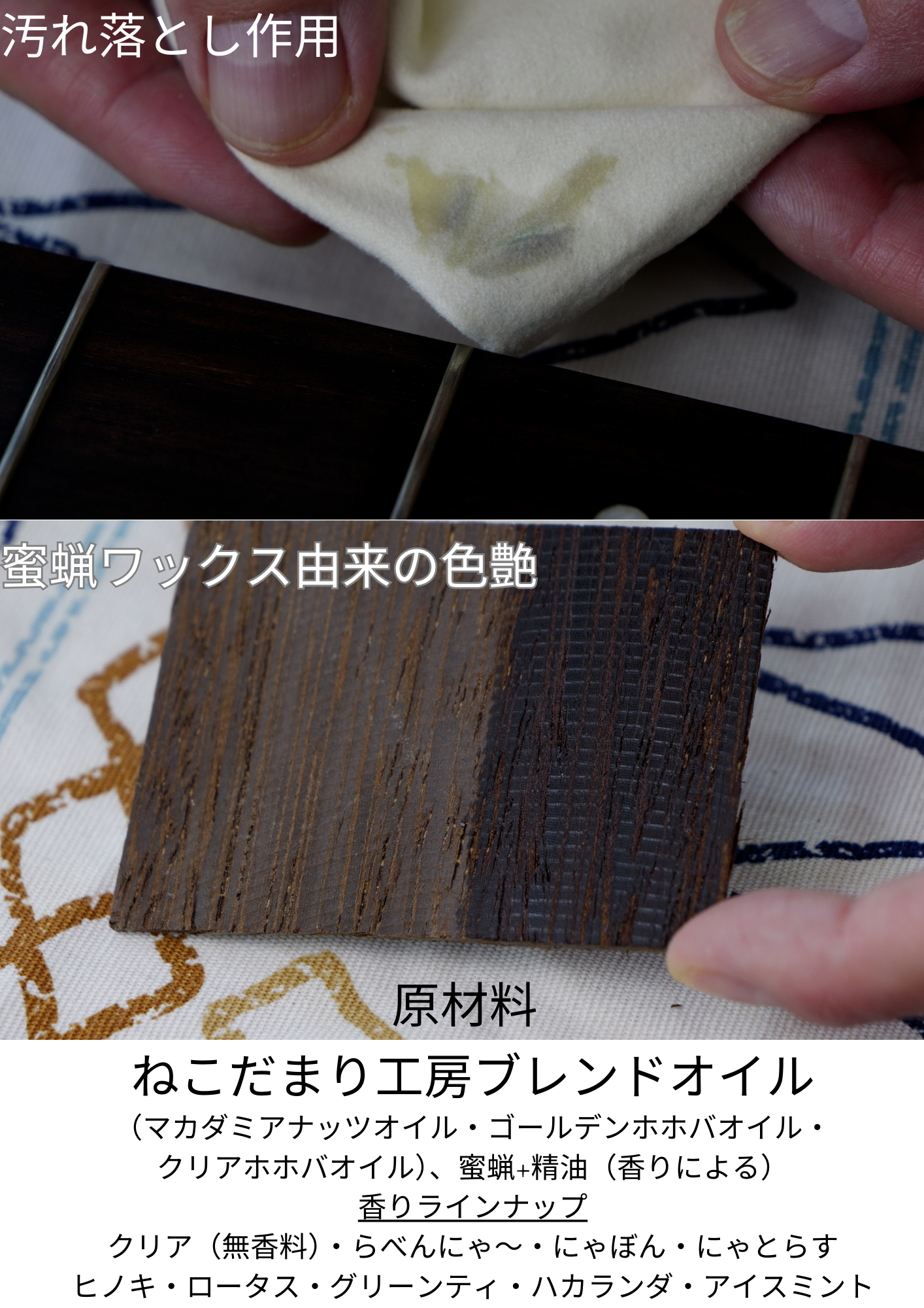 蜜蝋ワックス由来の深みのある色艶を得つつ、お手軽さを実現した指板用オイルで香り付きのバリエーションを展開。香りは、これまでねこだまり工房で開発しリリースしてきたオリジナルブレンドの香りから、無香料のクリアの他、ワックスシリーズより4種類、クリーナーシリーズより3種類、残暑を乗り切る為に開発した新作の香り、アイスミントを加えた全9種をリリースする。