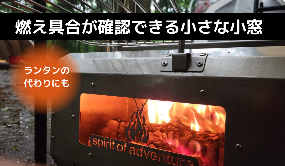 ・燃え具合はサイドの窓から確認でき、薪を追加するタイミングもすぐわかる・ガラス窓から見える炎の明かりが夜になればランタンの代わりにも