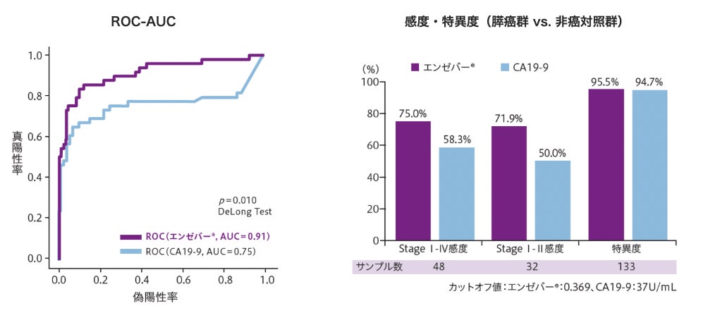 「エンゼバー®すい臓がん」は、本技術を利用して、サブタイプや翻訳後修飾の異なる酵素の活性を区別し、膵癌に特異的な4つの膵臓関連酵素の活性を血液中で高感度に捉えます。4つの酵素活性を組合せた識別式について、日米12施設の血液を用いた臨床研究で学習と性能評価を行いました。本臨床研究結果の詳細は今後に学会発表・論文にて公表予定です。