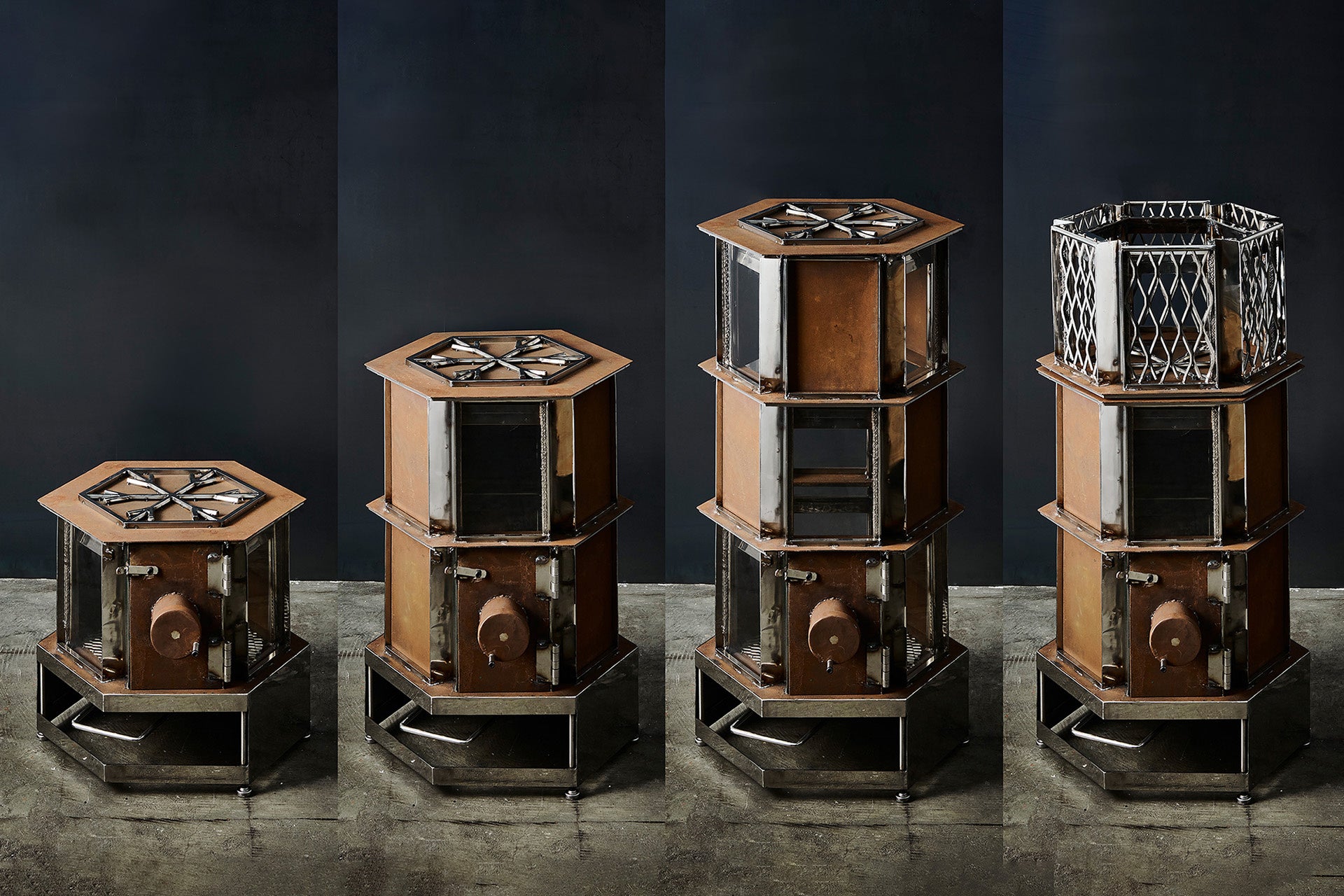 3段に分かれるユニット(燃焼室)のスリット(すき間)に専用のプレートを挿して、1段、2段、3段と、順に積み上げていく、スリット式ユニット構造になっています。