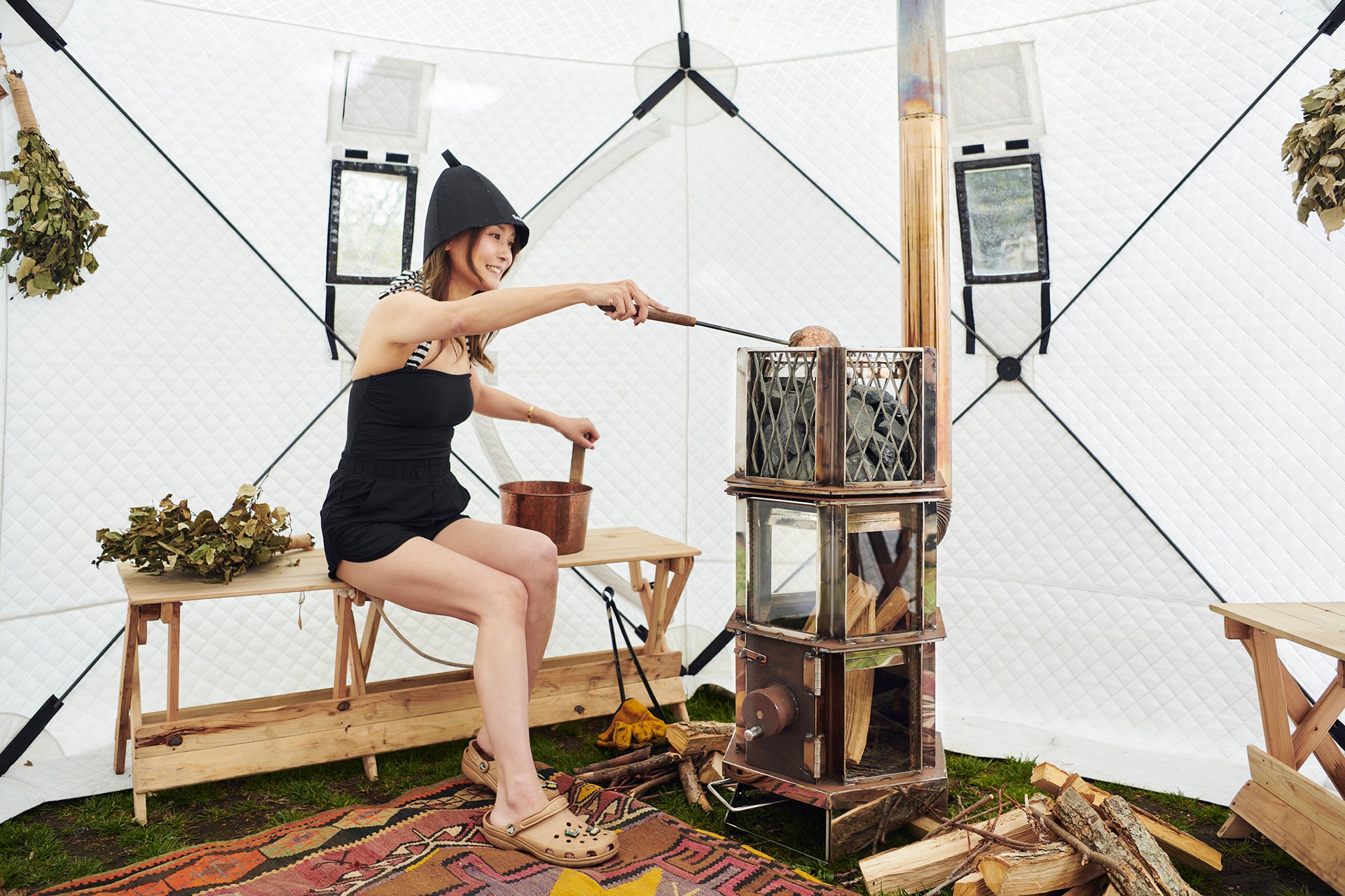 アウトドアシーンで、テントサウナを楽しみたい場合は、3段目をサウナストーンをいれるバゲットに変化させて。