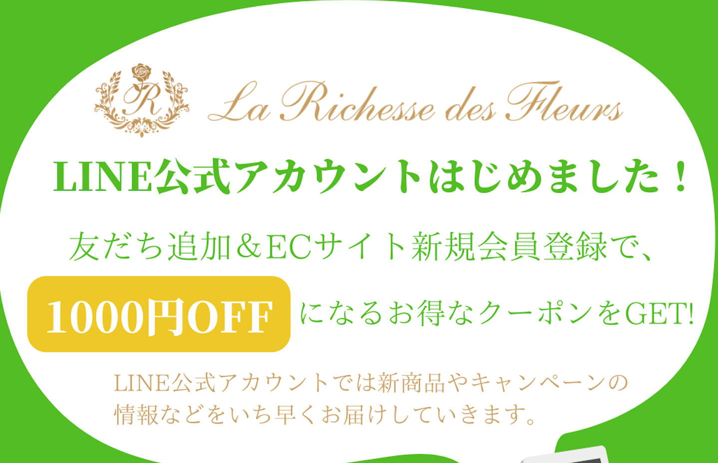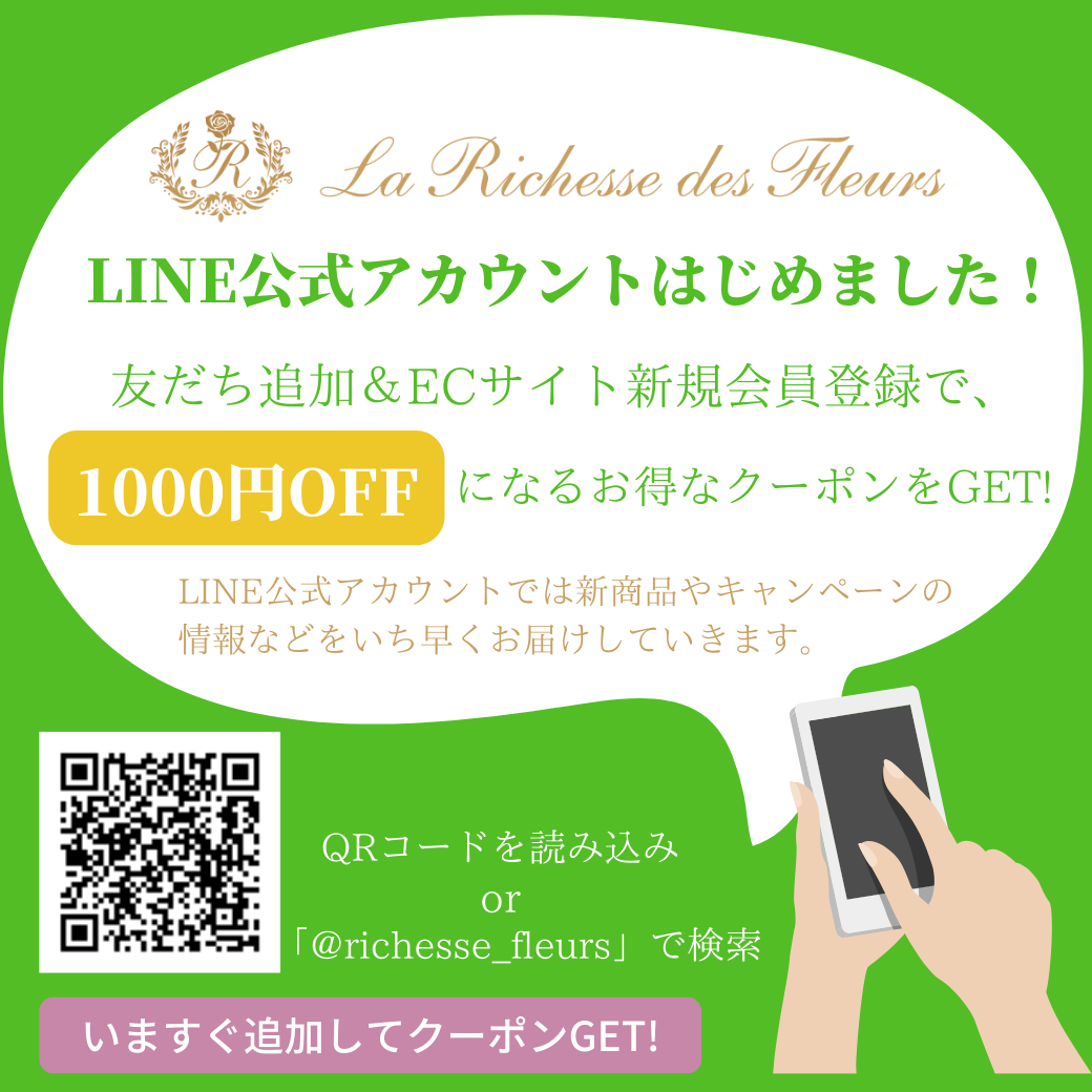 「La Richesse des Fleurs」LINE公式アカウントでは、新商品や期間限定のキャンペーン情報などを、いち早くお届けしていきます。ここでしか手に入らないお得な限定クーポンなども配信予定ですので、是非お見逃しなく!
