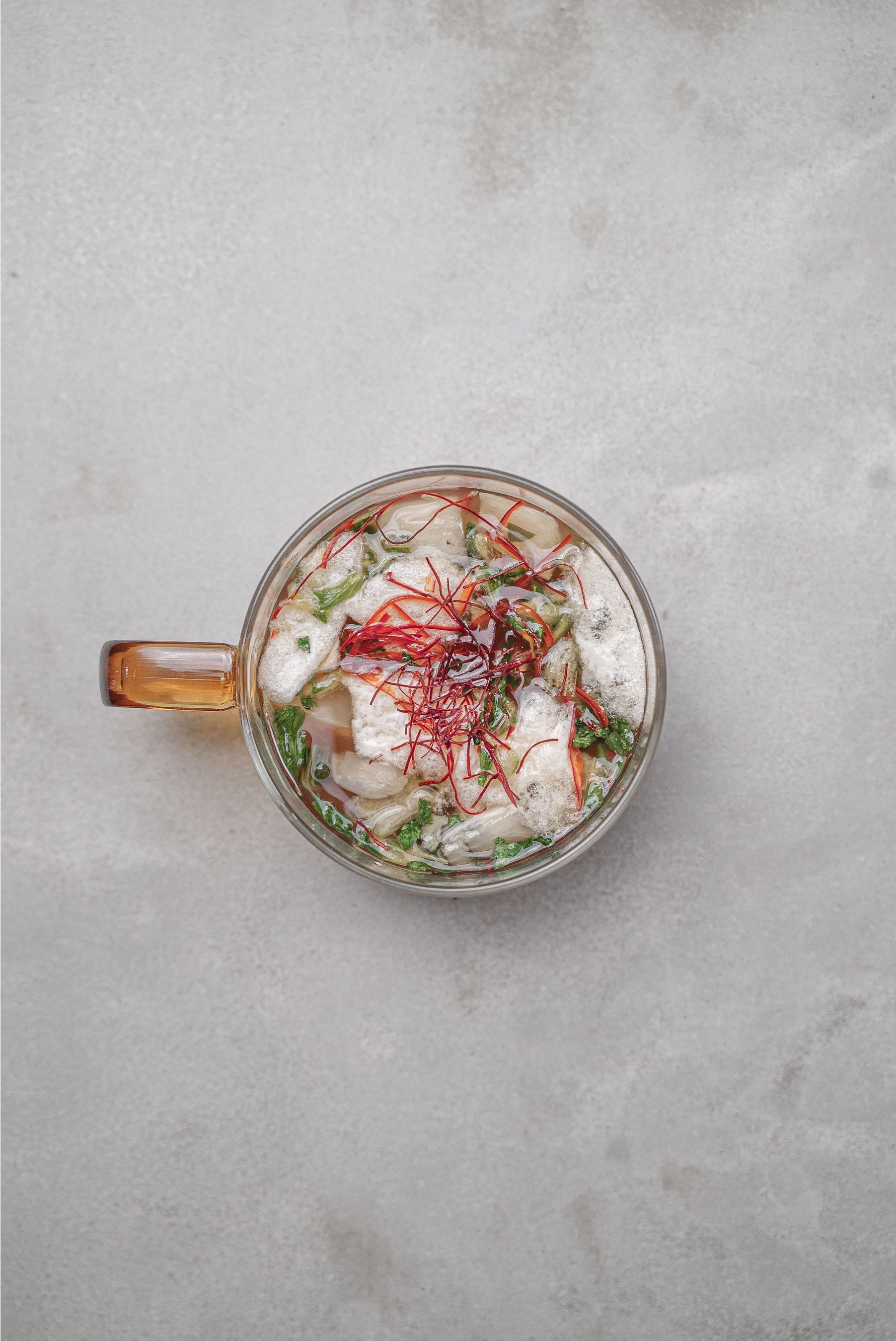 米みそにコチュジャンをブレンドし、糸唐辛子をトッピングし、具材には薬膳食材の白きくらげと、シャキシャキ食感にほのかな甘味感じる青梗菜をチョイスしました。インパクト大ですが、糸唐辛子の辛さは控えめで深いコクを味わえる韓国風スープ。