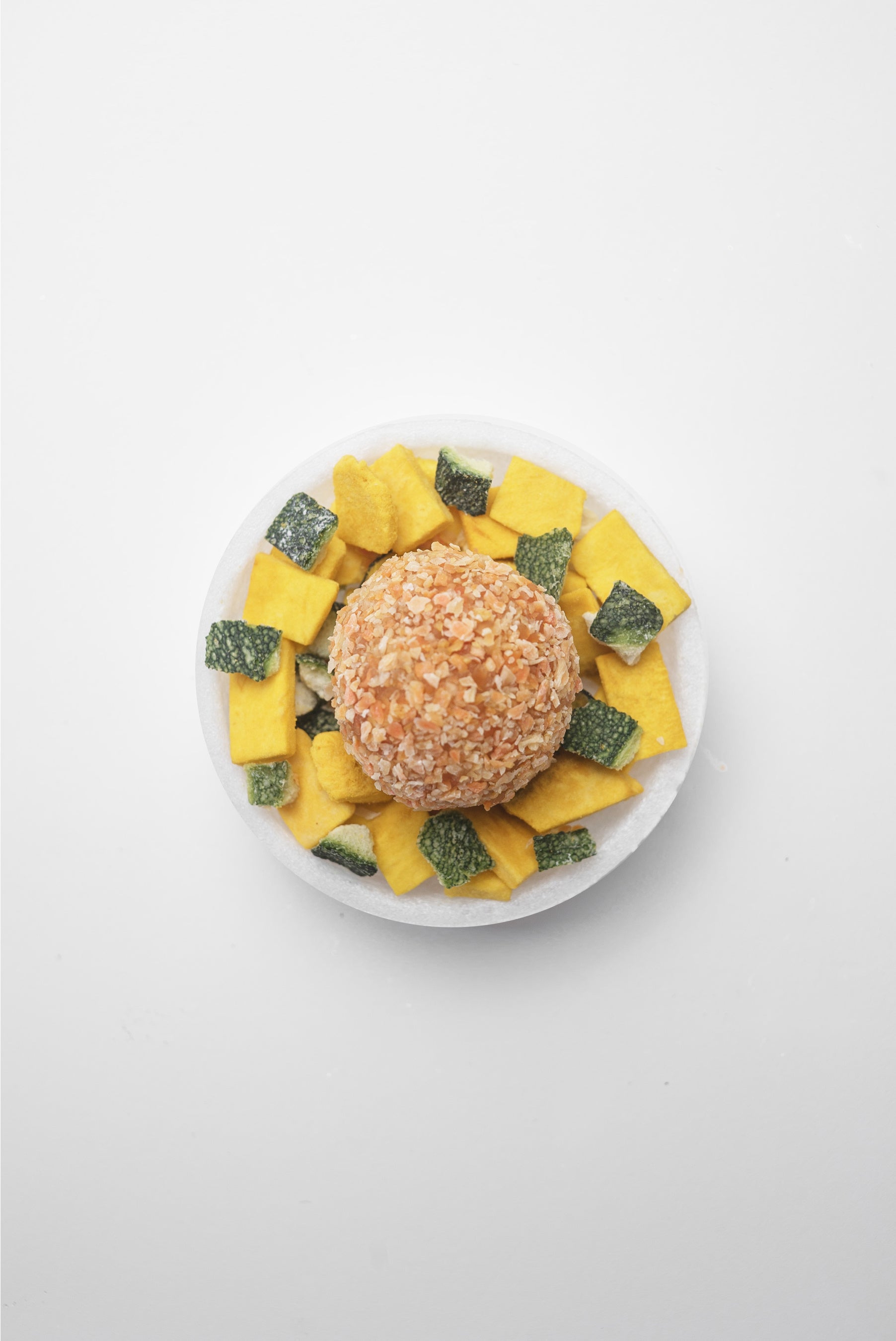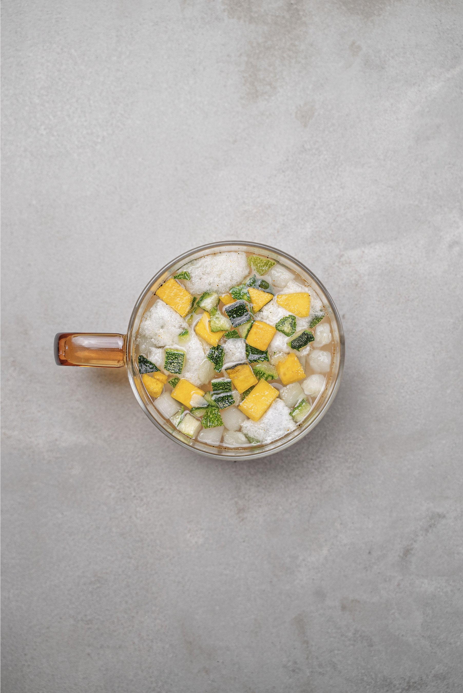 米みそに人参チップをトッピングし、南瓜、ズッキーニを添えたベジスープ。夏の恵みを感じるたっぷりの野菜で食べごたえ抜群かつヘルシー。ビタミンカラーのみそスープは目からも、内側からもパワーをチャージしてくれます。