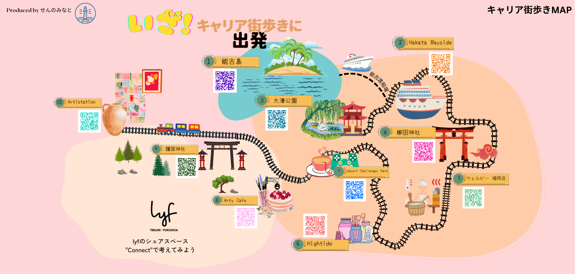 本コラボレーションにより、せんのみなととlyf Tenjin Fukuokaは「キャリア街歩きマップ」の提供を開始します。(※2023年3月1日よりlyf Tenjin Fukuokaにてマップの配布を開始いたします。)