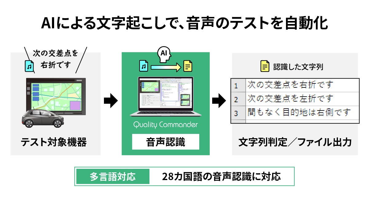 音声をAI学習の言語モデルを用いて、テキストデータに変換できます。これによりスマートフォンの発着信テストや、カーナビゲーションの音声案内といったテストの幅を広げることができます。28カ国語に対応し、多言語のテストでも利用できます。従来の話し言葉判定とは異なり、期待値の音声ファイルは不要となります。
