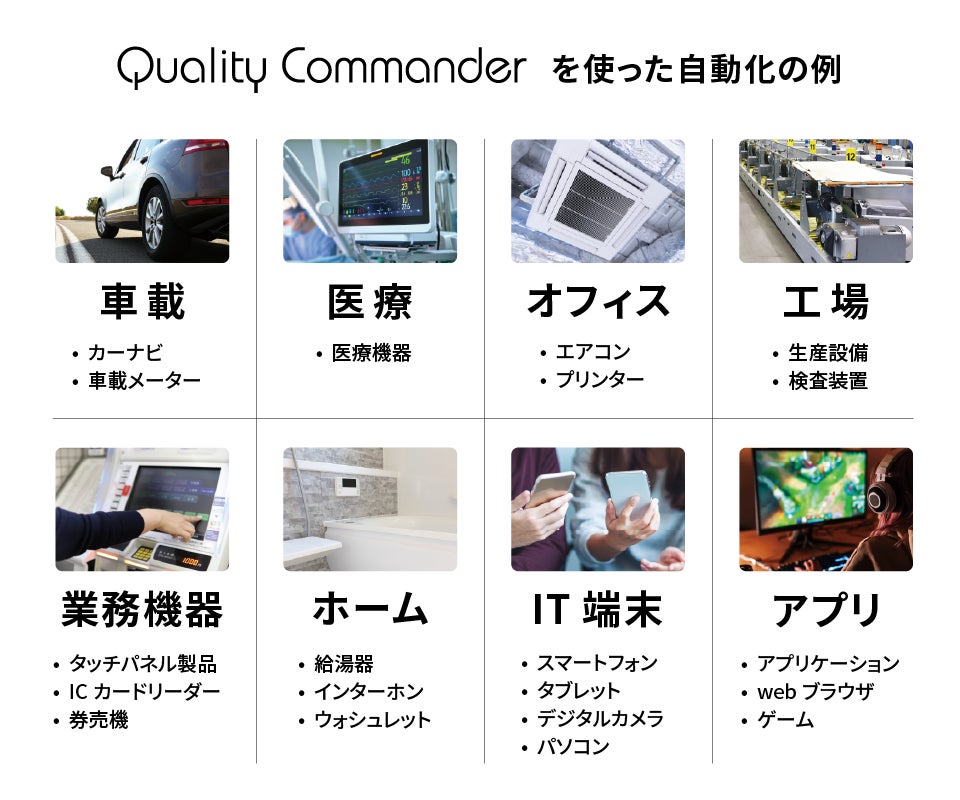 Quality Commanderは自動テストシステムとして家電や車載機器などのメーカーに幅広く導入され、テストの効率化やソフトウェアの品質改善に効果を発揮しています。また、組込み機器向けの物理操作による自動テストだけでなく、AndroidやWindows、LinuxなどのOS環境で動作するソフトウェアの自動テスト、24時間動き続けるサービスの定点監視、さらにはシミュレータソフトの自動操作による製品試験といった用途にも適用され、ますます利用の幅が広がっています。今後もより多くの場面におけるテスト効率の向上を目指し、開発を進めてまいります。