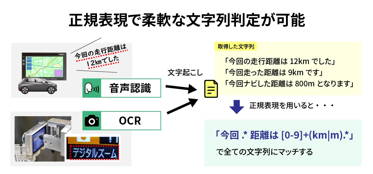 これまでは、文字列は完全一致や部分一致での判定が可能でした。正規表現により、より柔軟な文字列判定を実施可能となります。音声認識やOCRで取得した文字列で判定を行う際に、文字列の揺らぎを正規表現で吸収することで、シンプルな判定文で判定可能です。